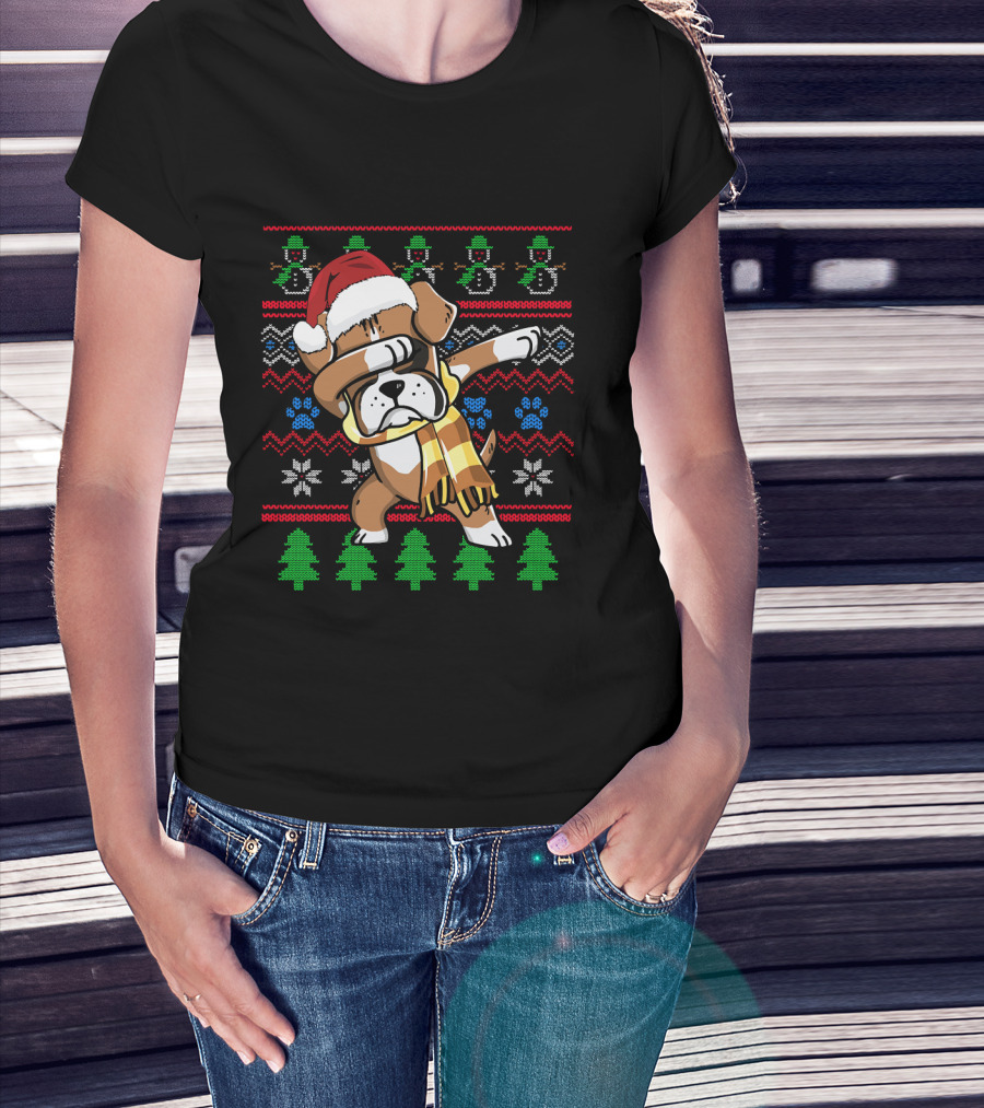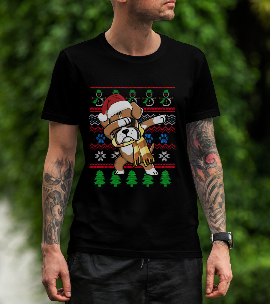 Xmas Boxer Dabbing Santa Hat UglyStyle Sweater Pattern Snowflakes Trees T-Shirt