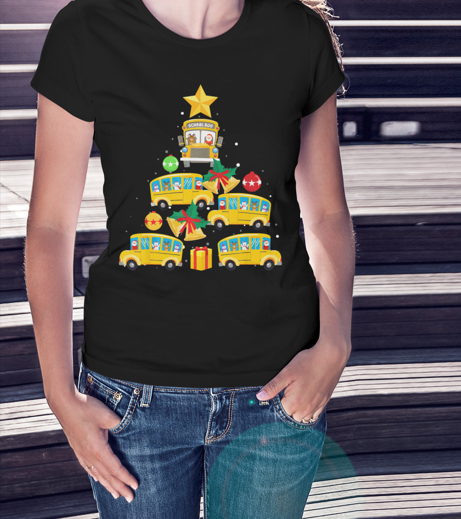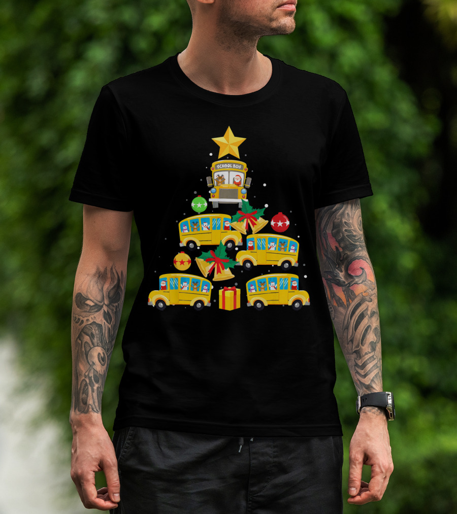 School Bus Christmas Tree With Santa Reindeer Ornaments And Gifts T-Shirt