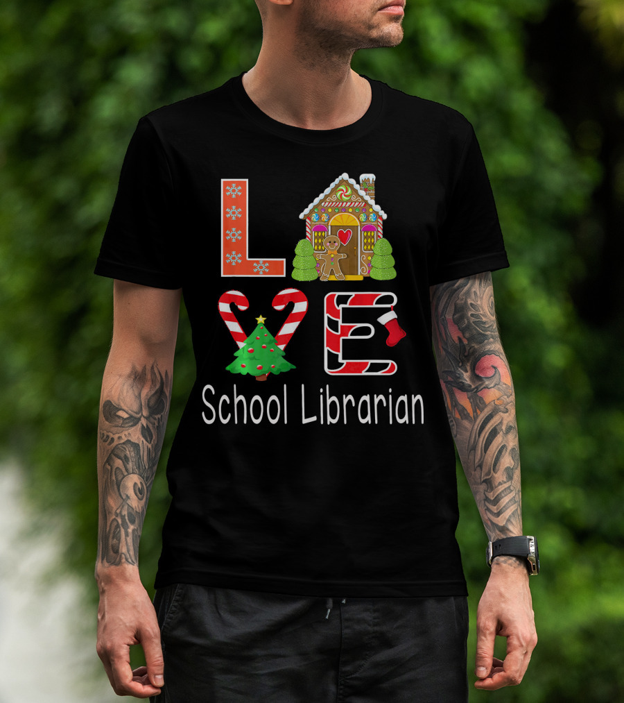 LOVE School Librarian Merry Christmas Gingerbread House Candy Cane Tree T-Shirt