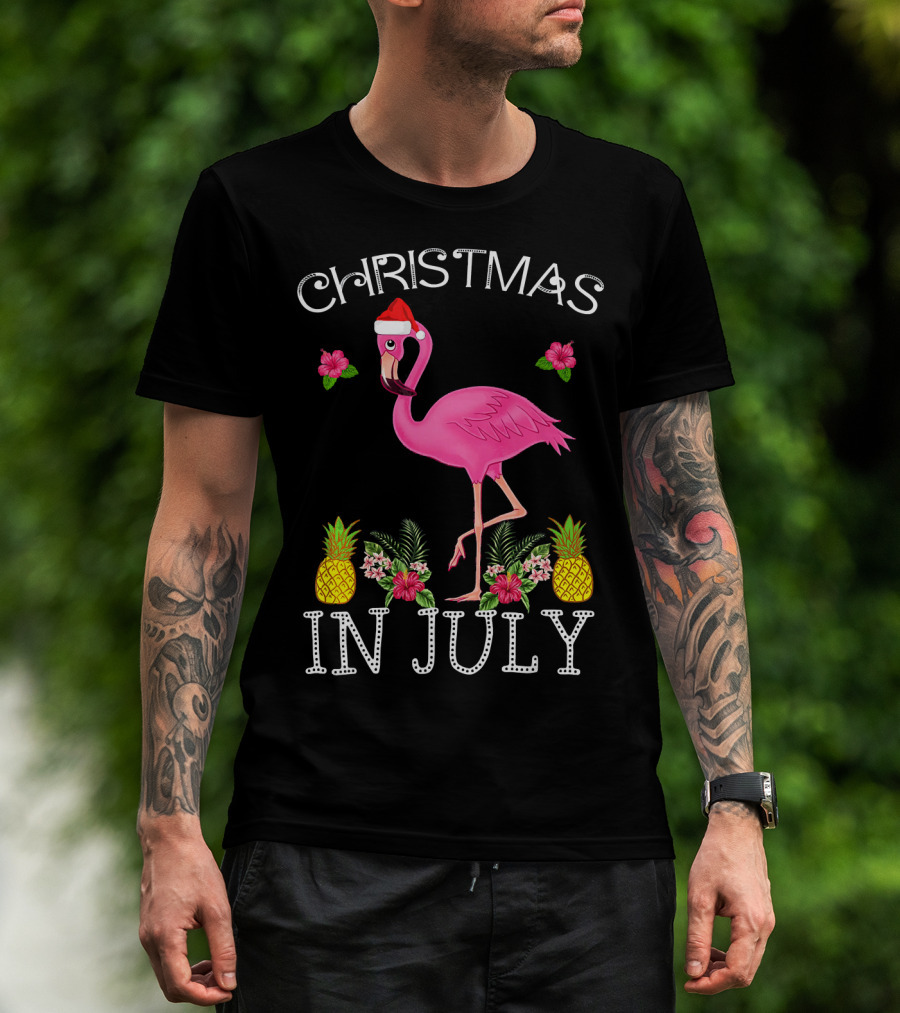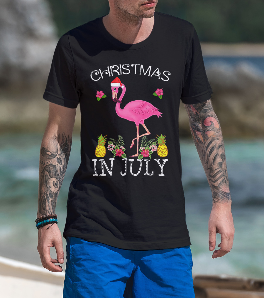 Christmas In July Pink Flamingo Santa Hat Pineapples Floral T-Shirt