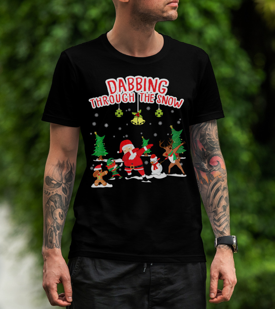 The Dabbing Through The Snow Santa Reindeer Gingerbread Snowman Christmas Trees T-shirt is designed for everyday wear and a consistent fit. Fabric is pre-shrunk ring-spun cotton with durable stitching. See the size chart below for exact measurements.