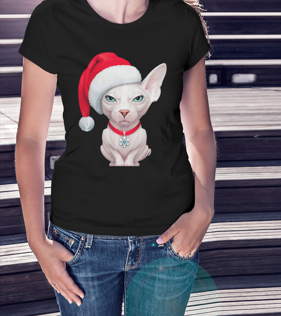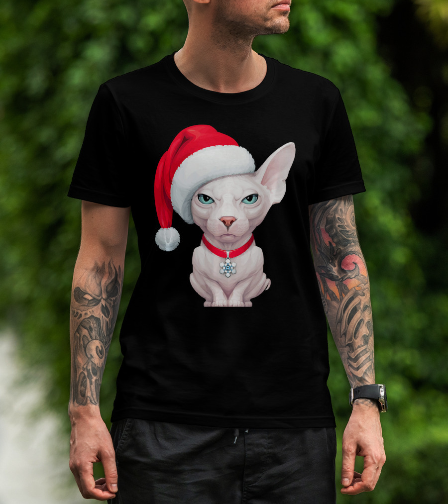 Sphynx Cat Santa Hat Christmas Holiday Festive Pet Charm T-Shirt