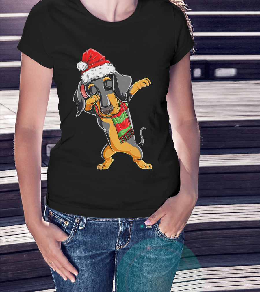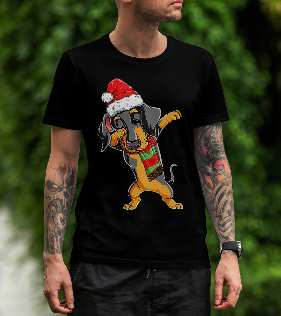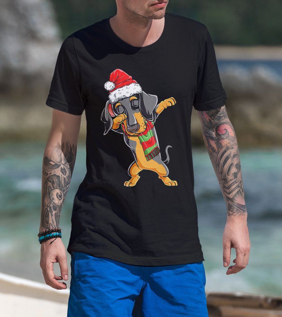 Dabbing Dachshund Santa With Christmas Hat And Scarf T-Shirt