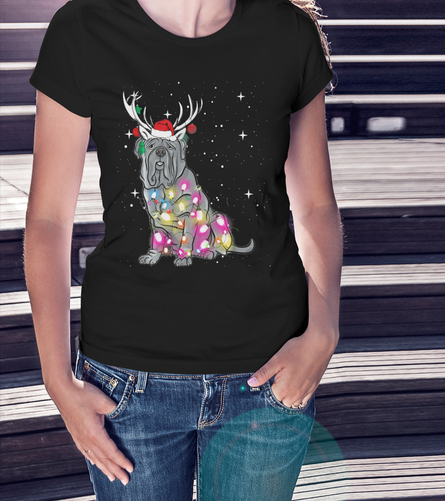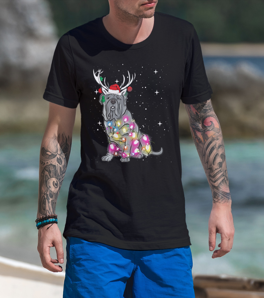 Neapolitan Mastiff With Christmas Lights And Santa Hat In Snowy Night T-Shirt