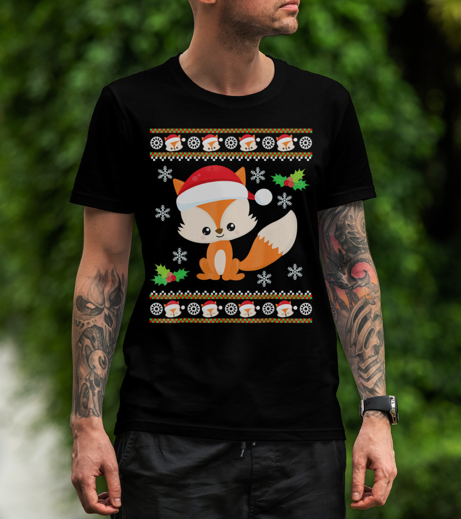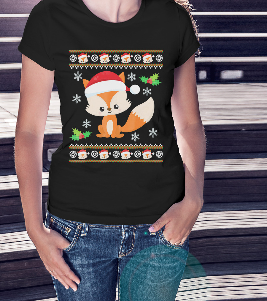 Cute Festive Fox With Santa Hat And Snowflakes T-Shirt