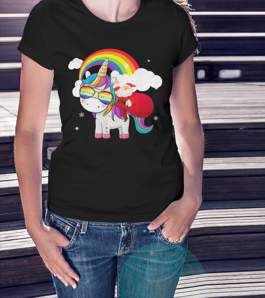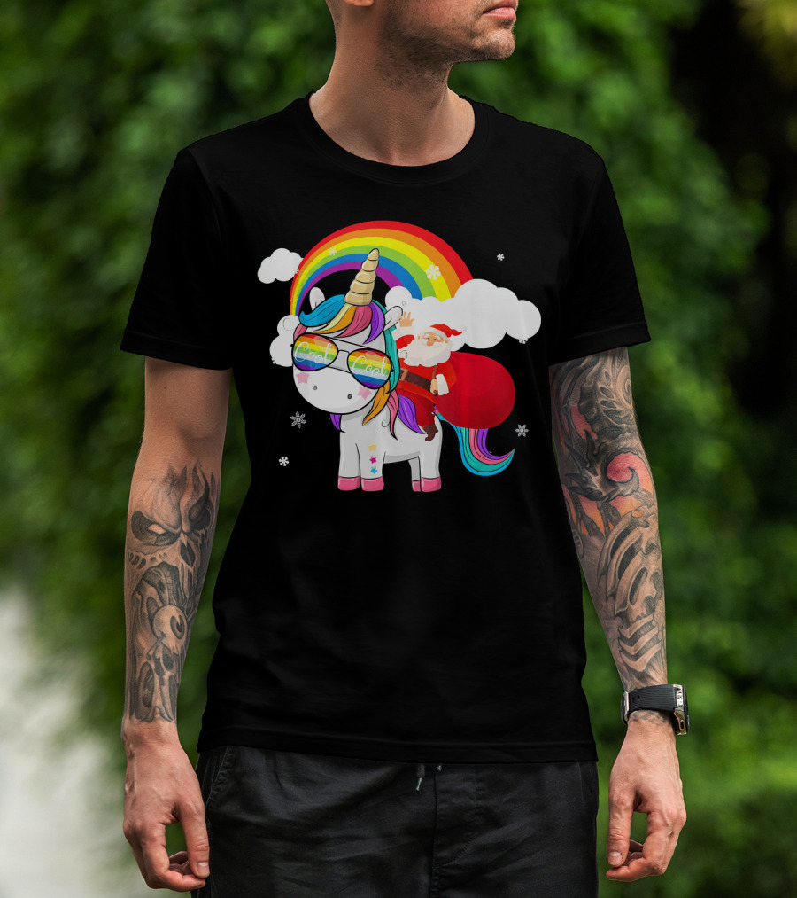 Cool Santa Riding Unicorn Rainbow Christmas Cos T-Shirt