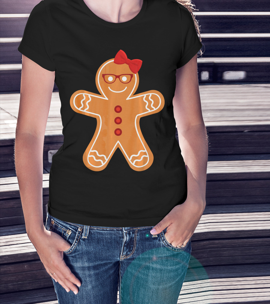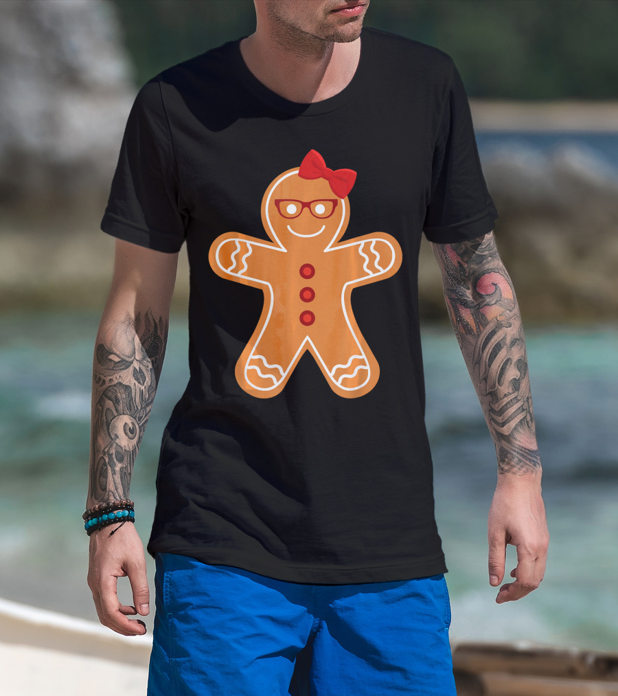 Gingerbread Girl Cookie With Glasses And Red Bow Christmas T-Shirt