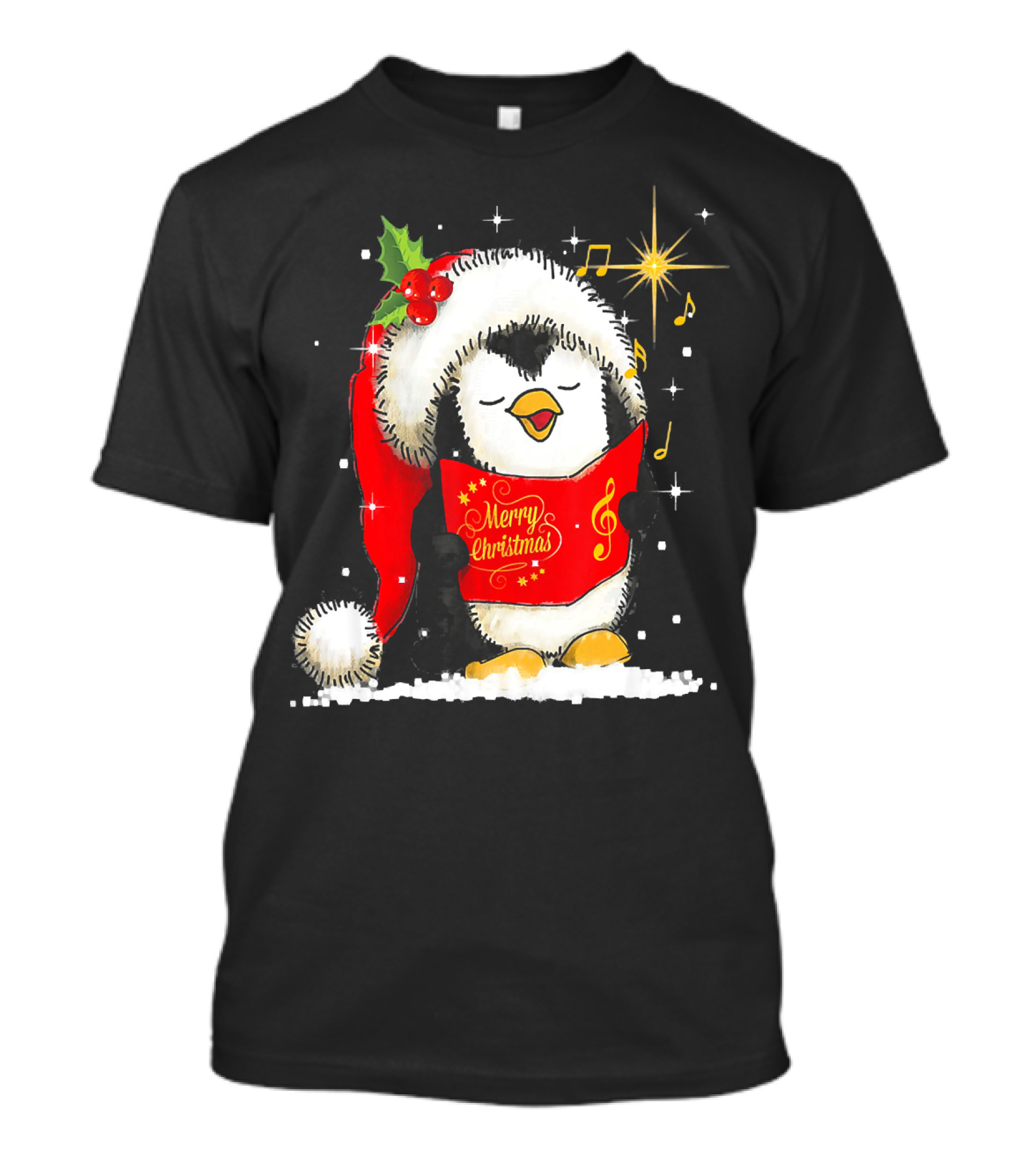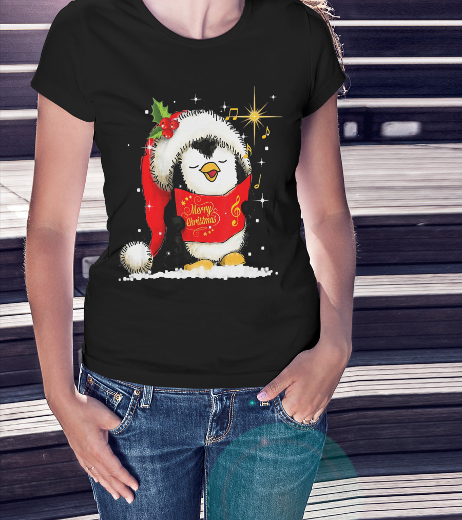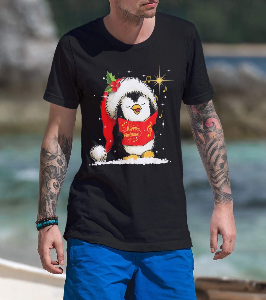 Merry Christmas Singing Penguin With Santa Hat And Music Notes T-Shirt