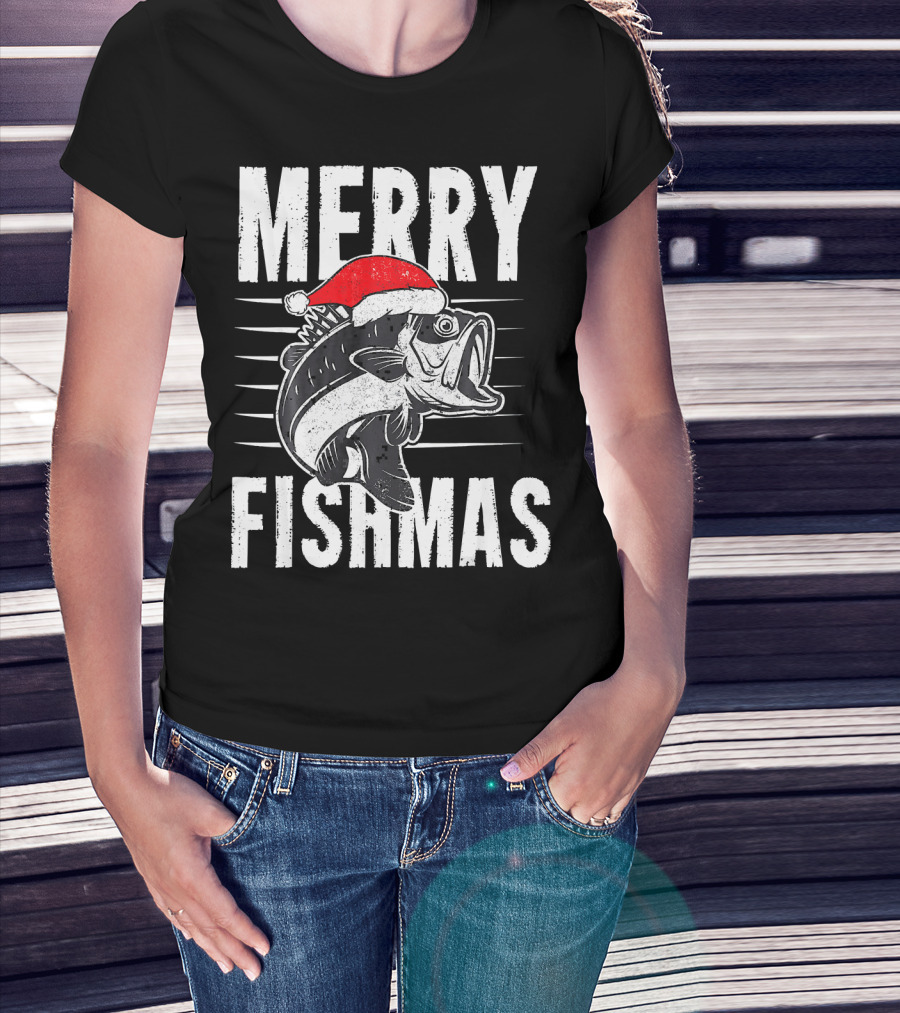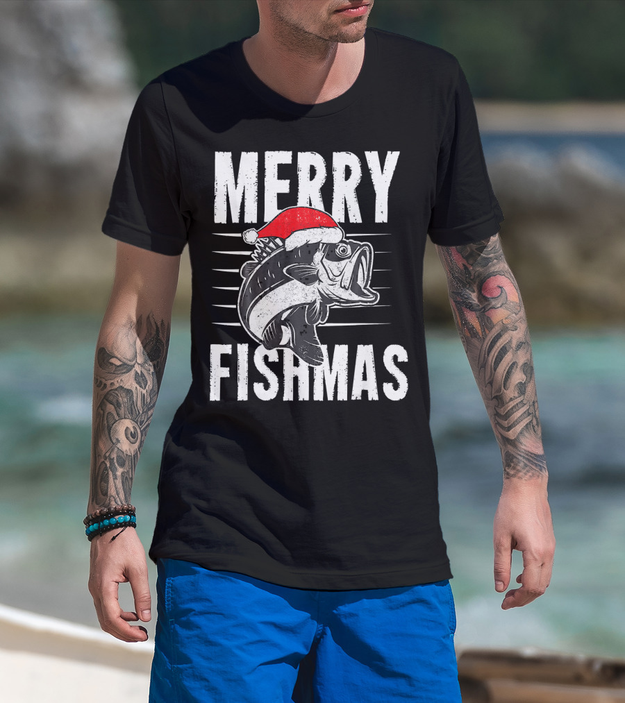 Merry Fishmas Funny Christmas Fishing Santa Hat Fish T-Shirt