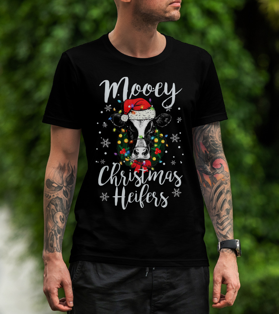 Mooey Christmas Heifers Santa Cow With Festive Lights And Snowflakes T-Shirt
