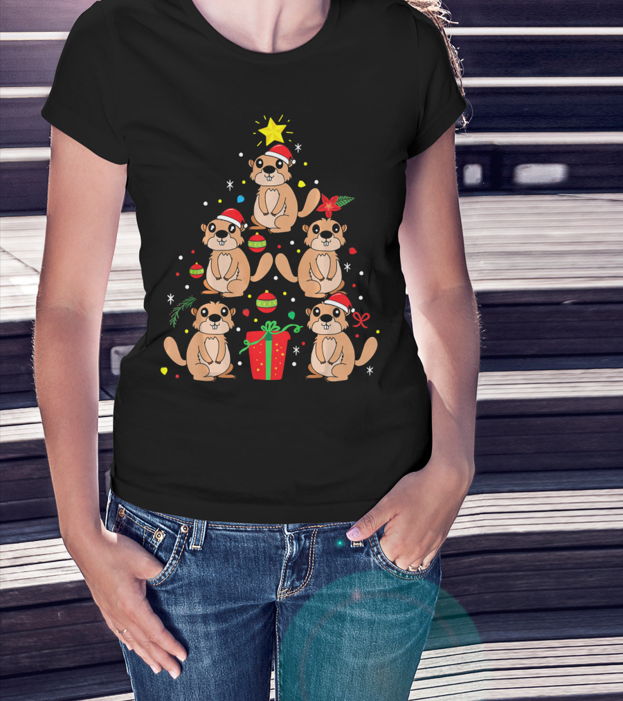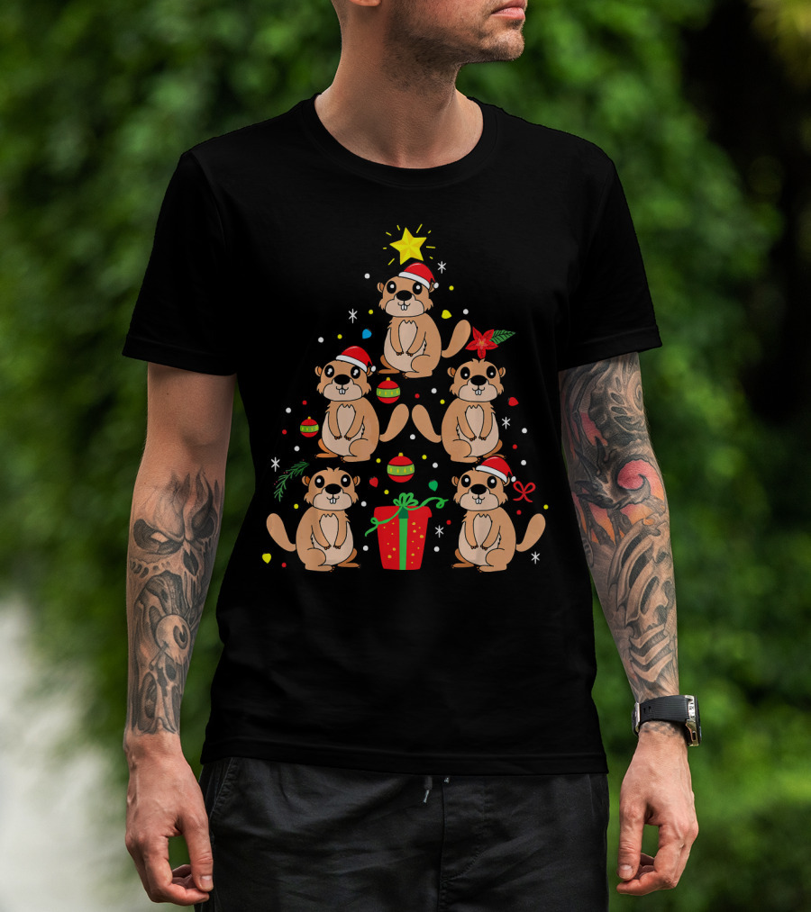 Groundhog Christmas Ornament Tree With Santa Hats And Gift T-Shirt