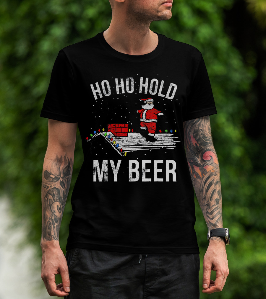 Ho Ho Hold My Beer Santa Skateboarding On Roof With Lights T-Shirt