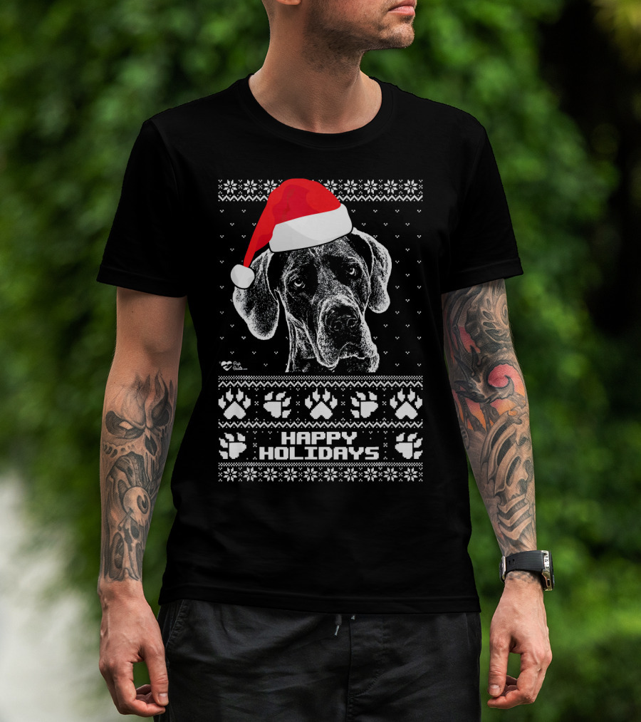 Great Dane Happy Holidays Santa Hat Paw Prints T-Shirt