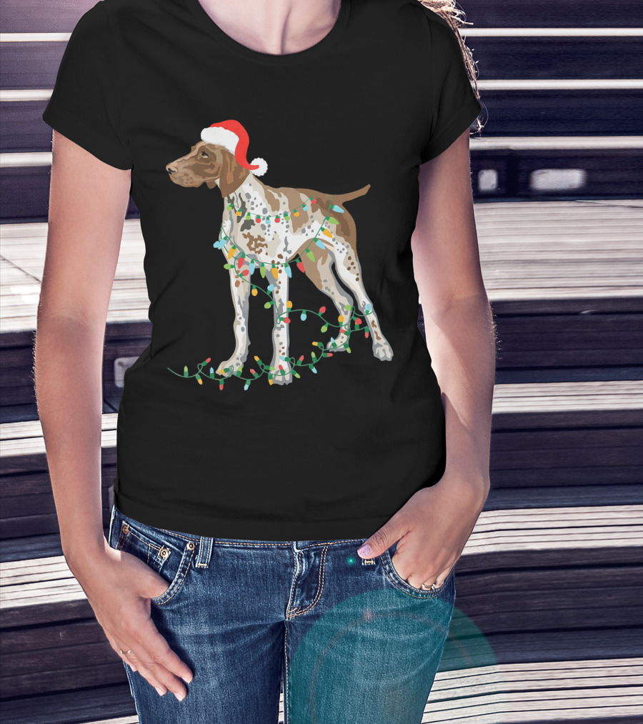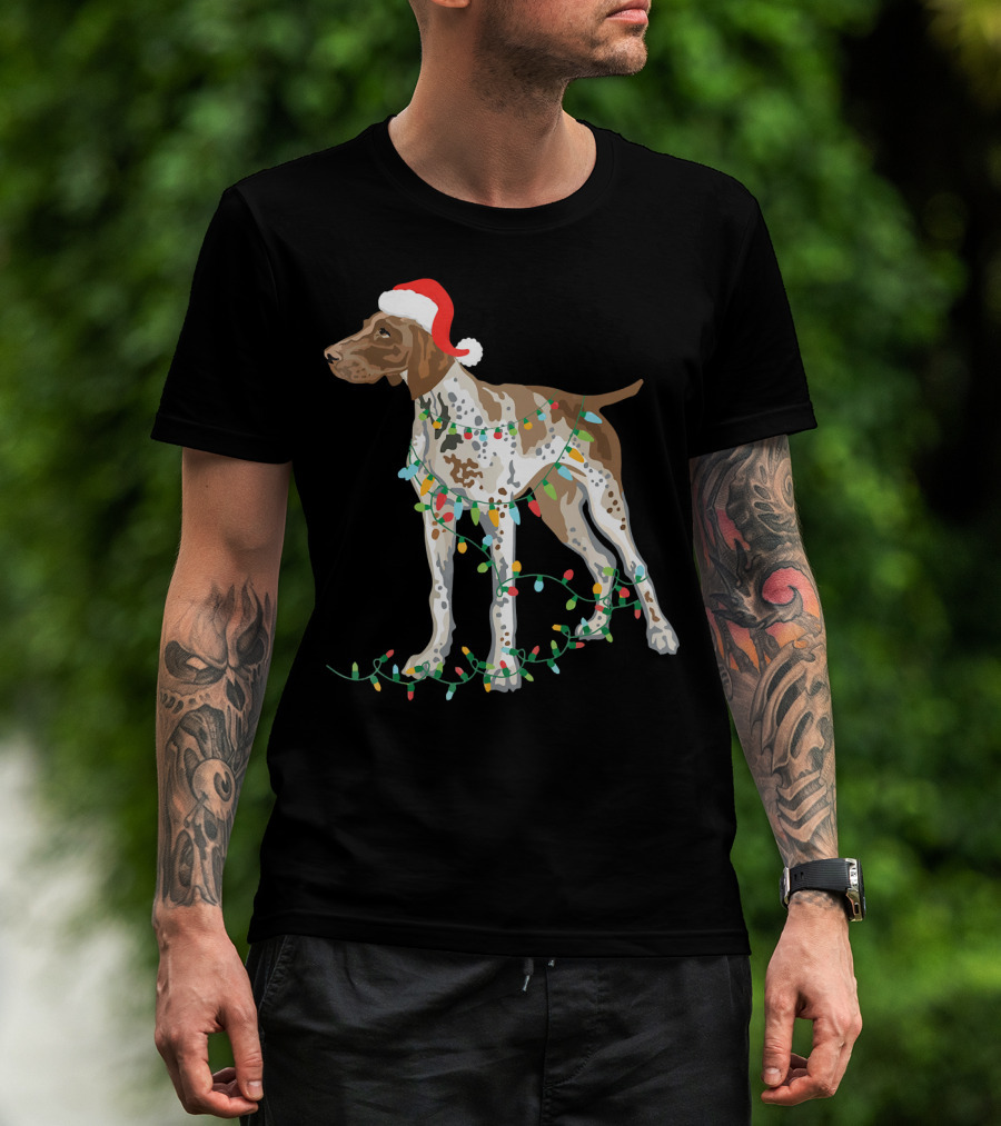 German Shorthaired Pointer Wearing Santa Hat With Christmas Lights Entwined T-Shirt