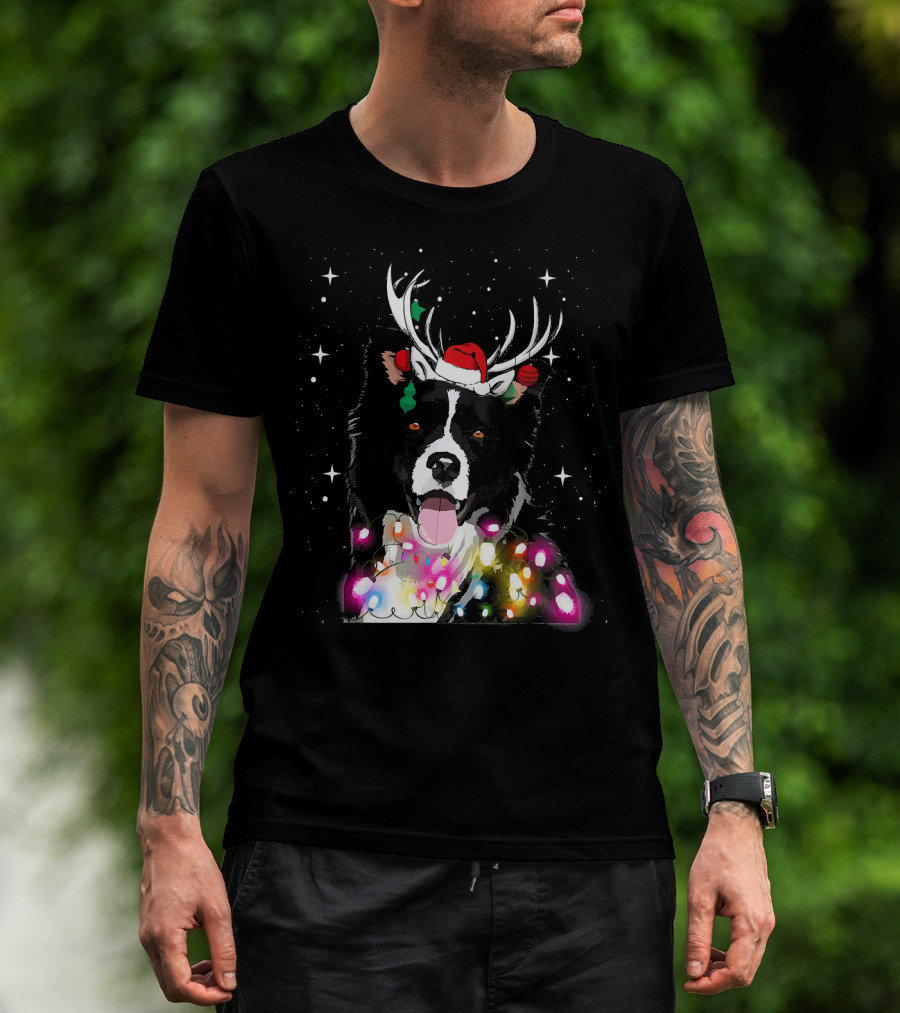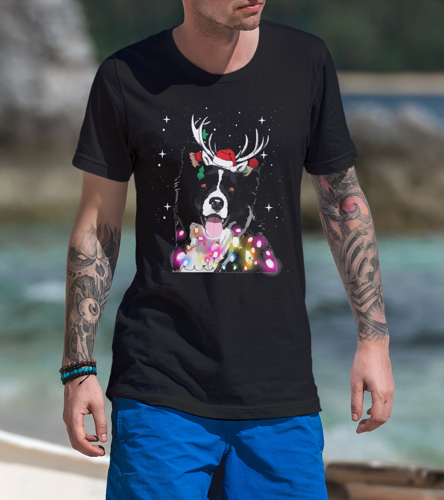 Border Collie In Santa Hat With Reindeer Antlers And Christmas Lights T-Shirt