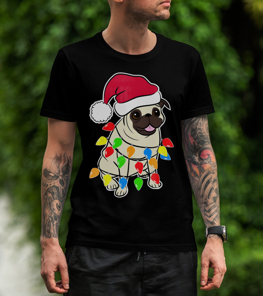 Christmas Pug Santa Pug With Festive Lights And Santa Hat T-Shirt