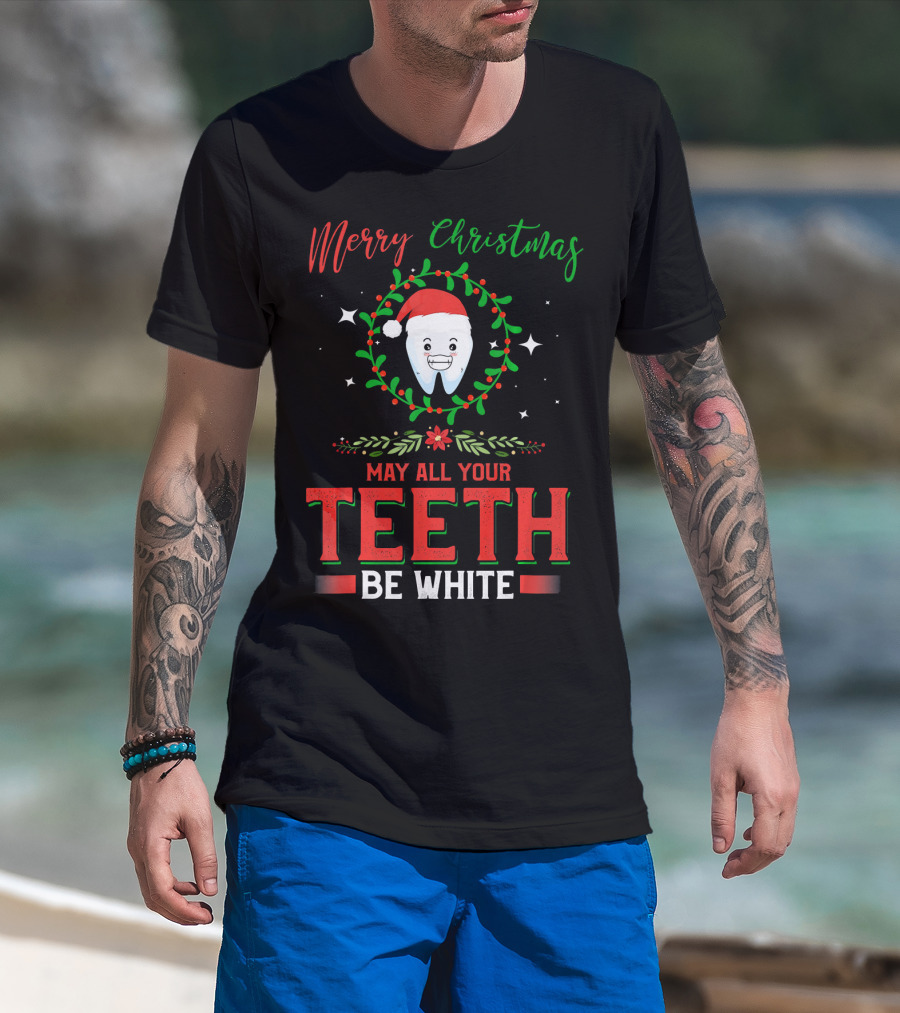 Merry Christmas May All Your Teeth Be White With Santa Tooth Wreath T-Shirt