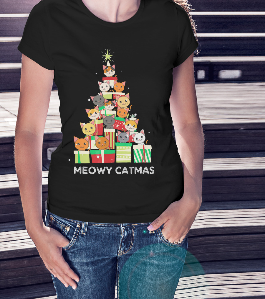 Meowy Catmas Funny Cat Christmas Tree Box T-Shirt