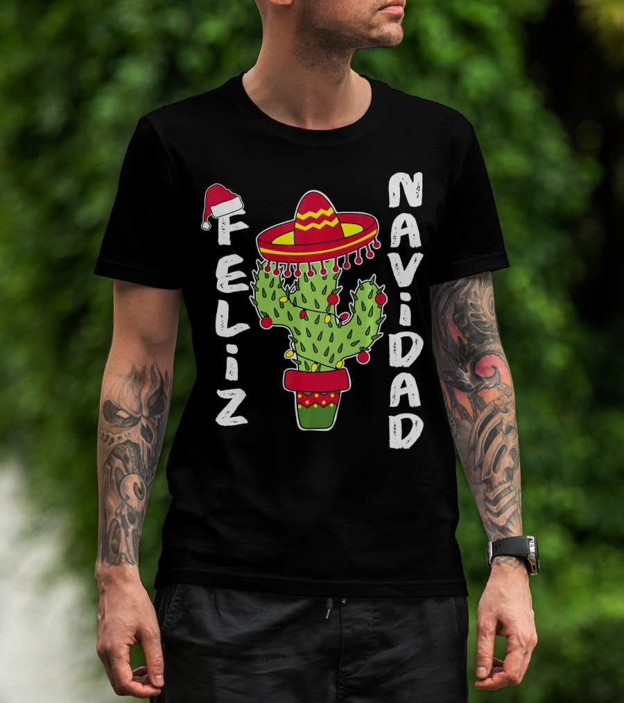Feliz Navidad Cactus With Santa Hat And Sombrero Holiday Spirit T-Shirt