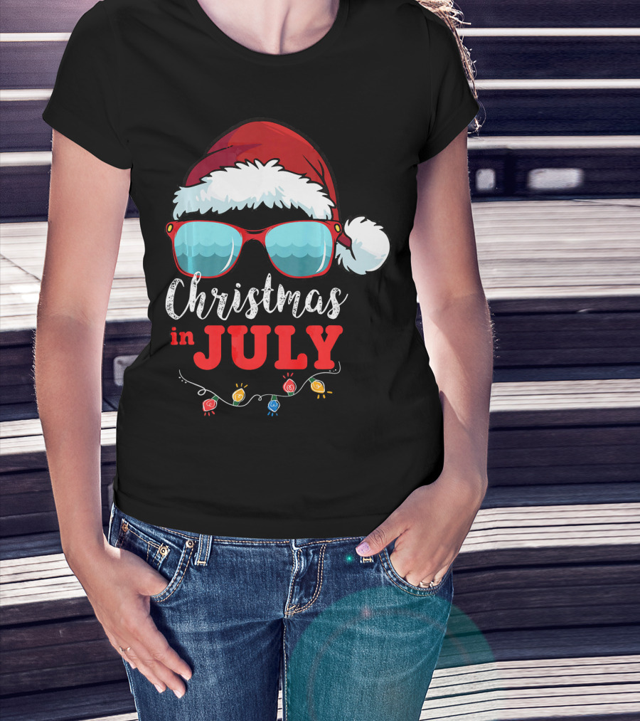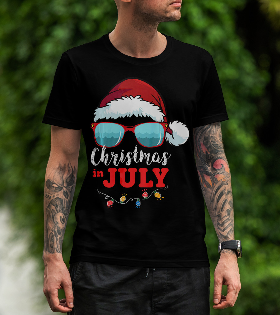 Santa Hat Sunglasses Christmas In July Holiday Lights T-Shirt
