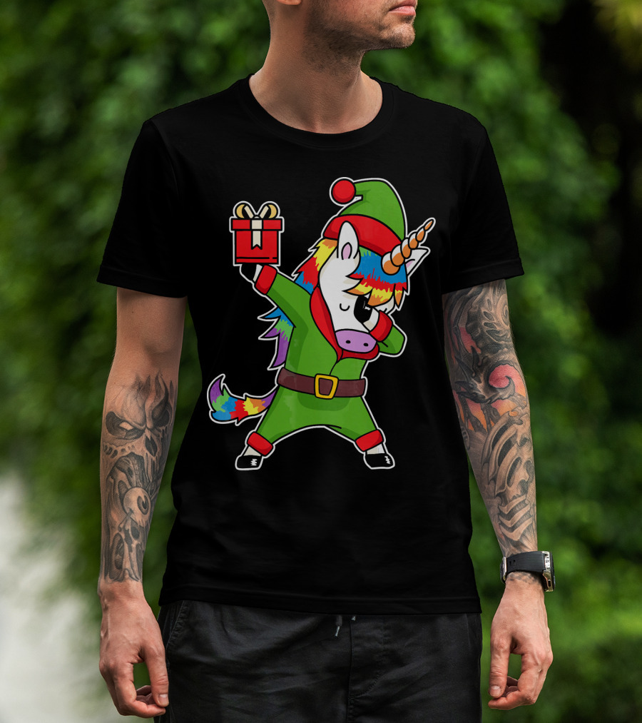 Christmas Dabbing Unicorn Elf With Rainbow Mane And Gift Box T-Shirt