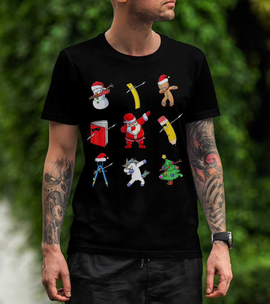 Funny Teacher Christmas Santa Dabbing Snowman Ruler Gingerbread Pencil Book Unicorn Tree T-Shirt