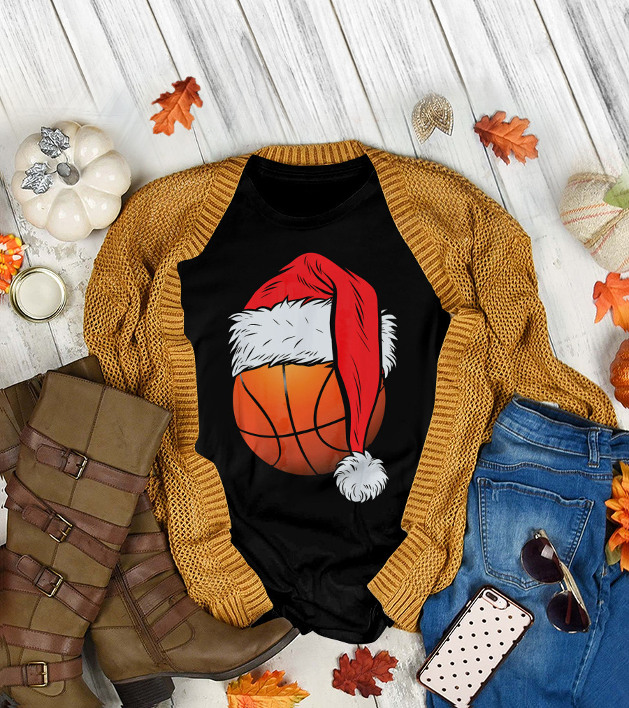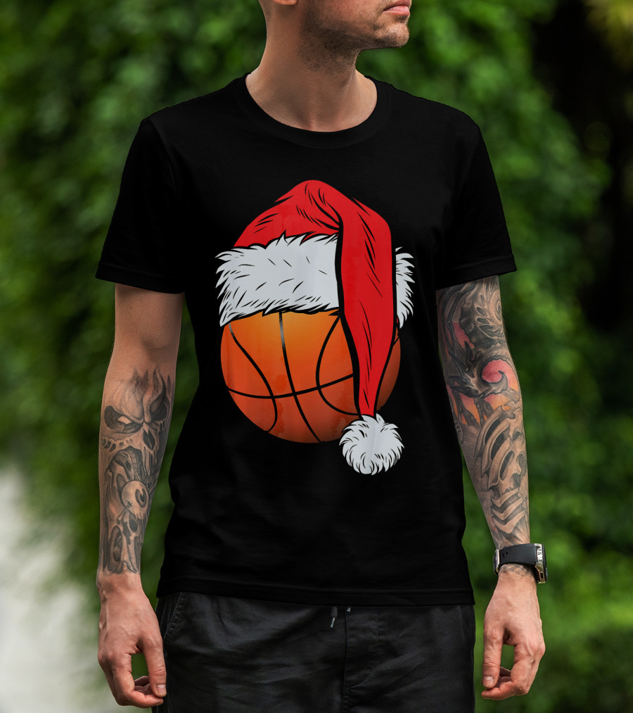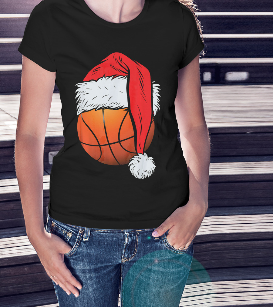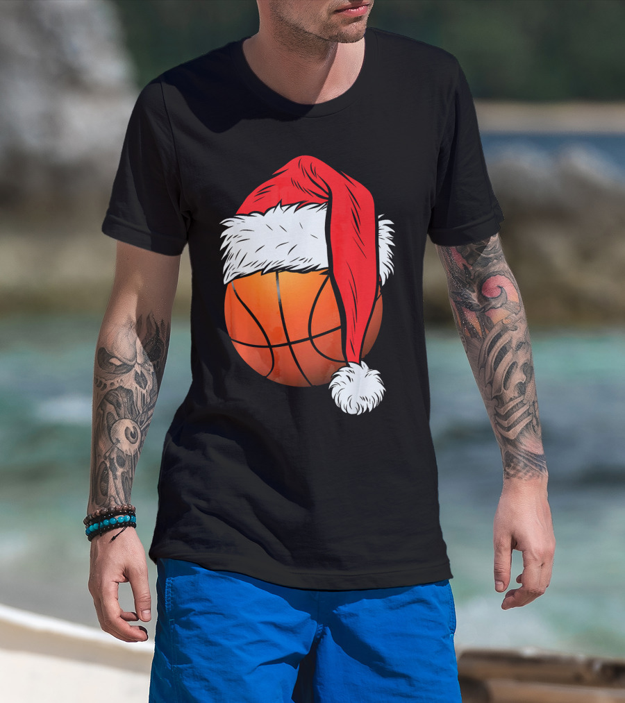 Christmas Santa Hat On Basketball Ball T-Shirt