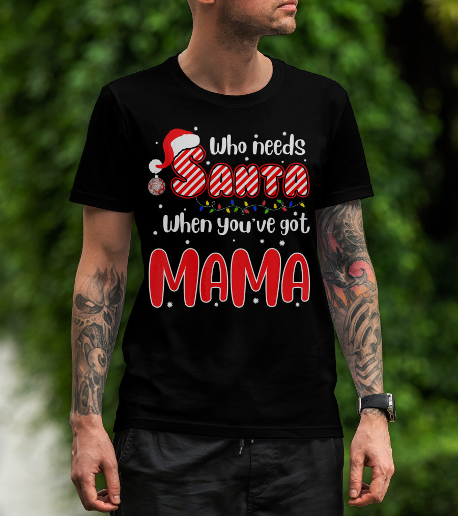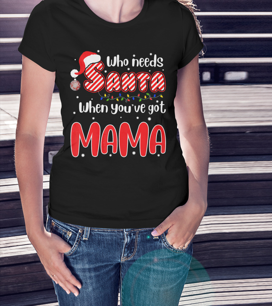 The Who Needs Santa When Youve Got Mama Santa Hat Christmas Lights T-shirt is designed for everyday wear and a consistent fit. Fabric is pre-shrunk ring-spun cotton with durable stitching. See the size chart below for exact measurements.