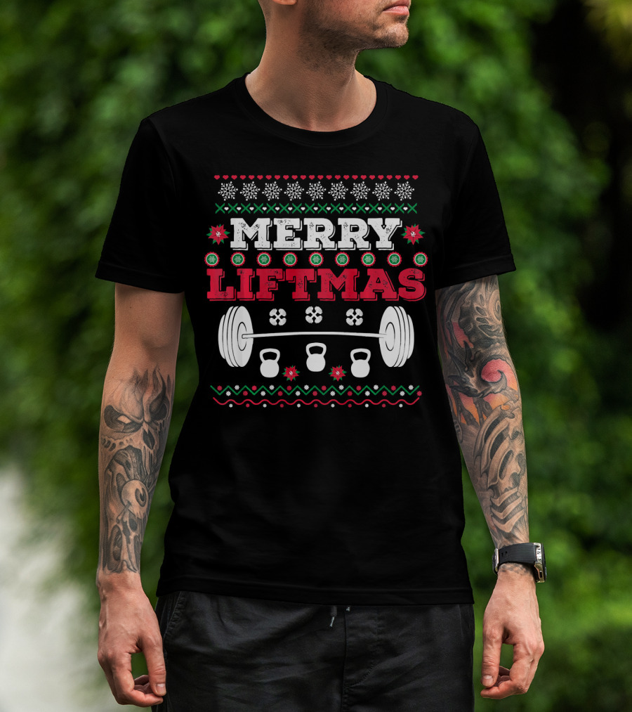 Merry Liftmas Funny Workout Barbell Kettlebell Christmas T-Shirt