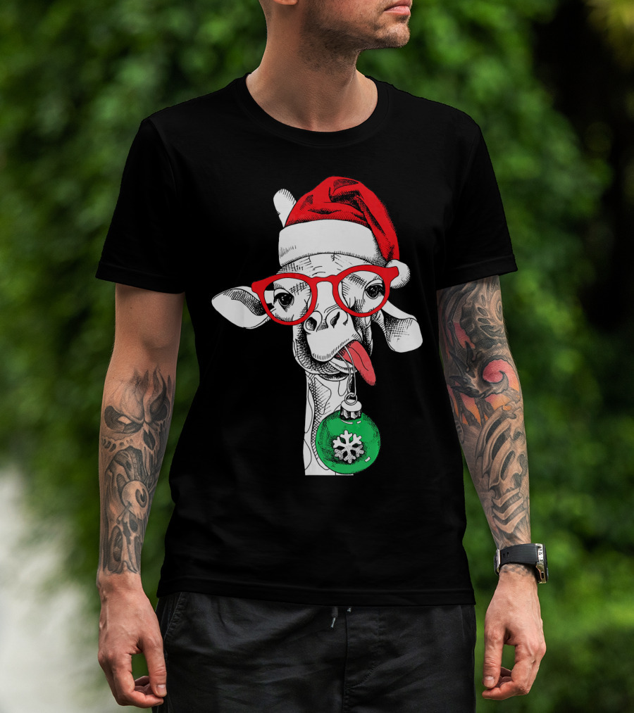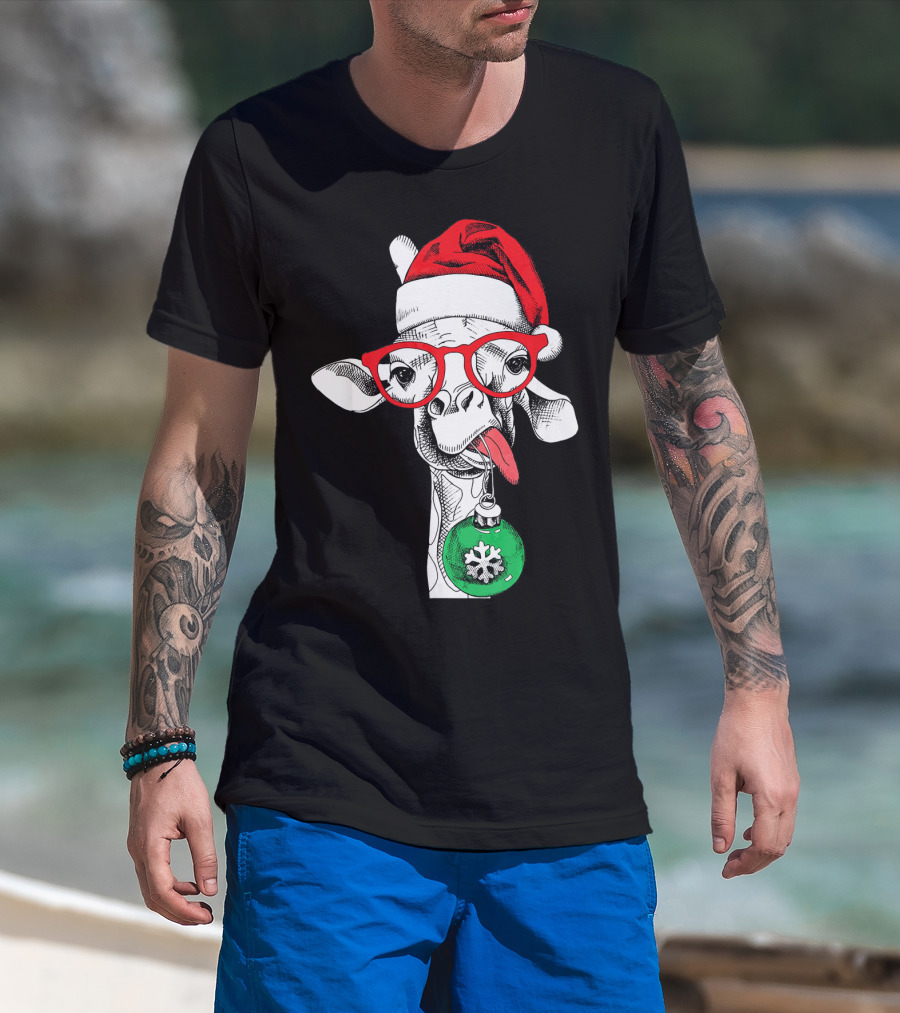 Santa Hat Giraffe Red Glasses Christmas T-Shirt