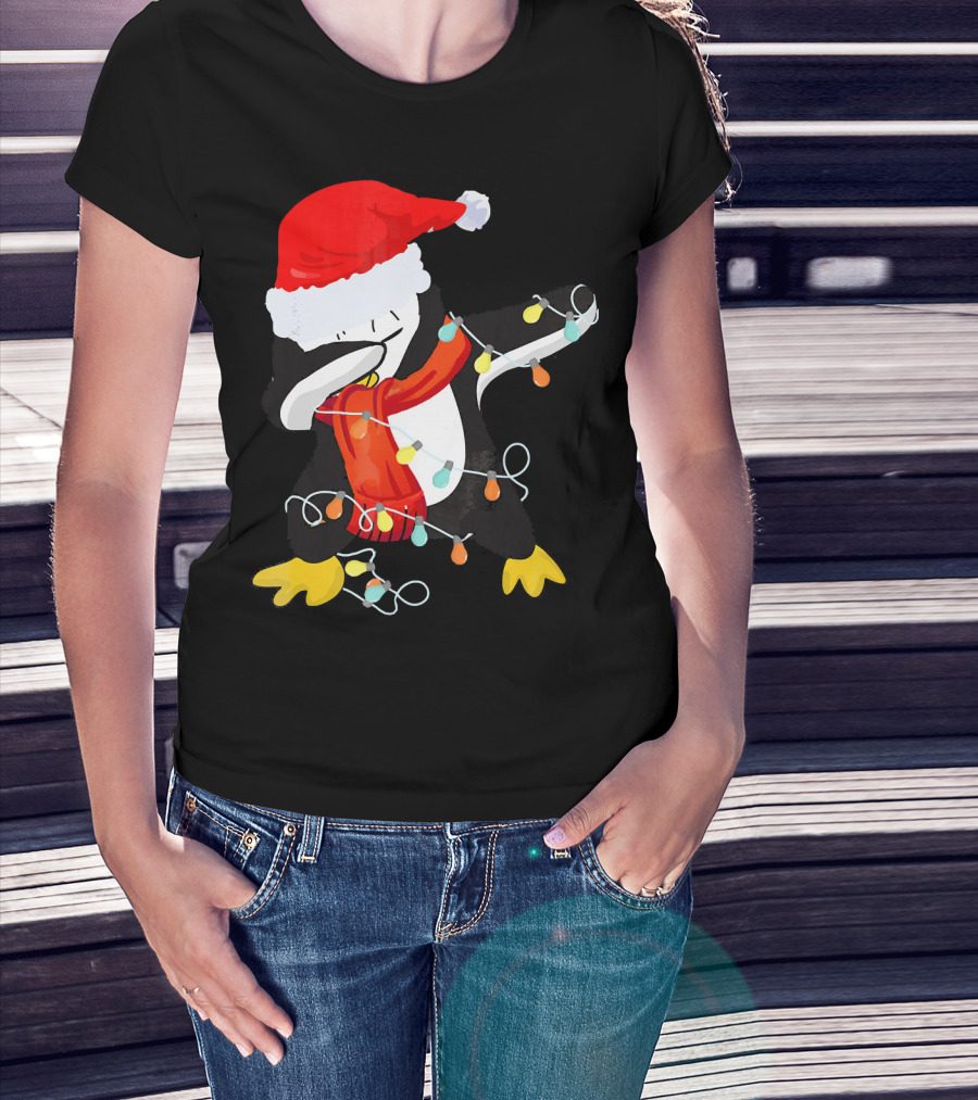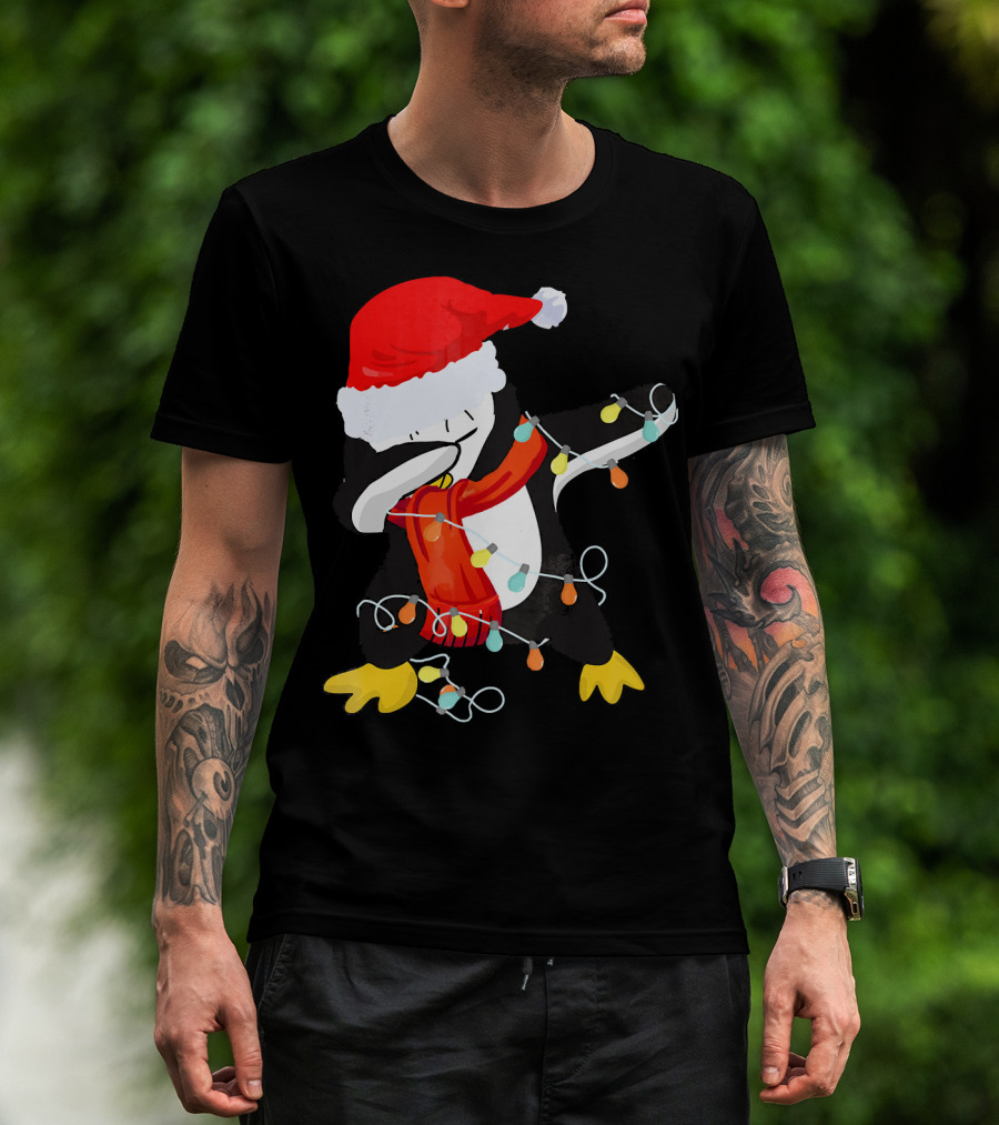 Dabbing Penguin Santa Christmas Lights T-Shirt