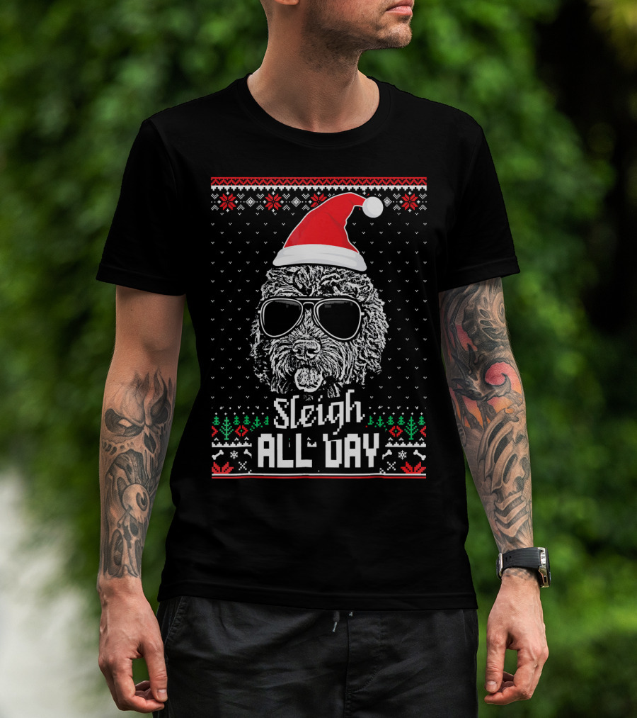 Sleigh All Day Christmas Labradoodle With Santa Hat And Sunglasses T-Shirt