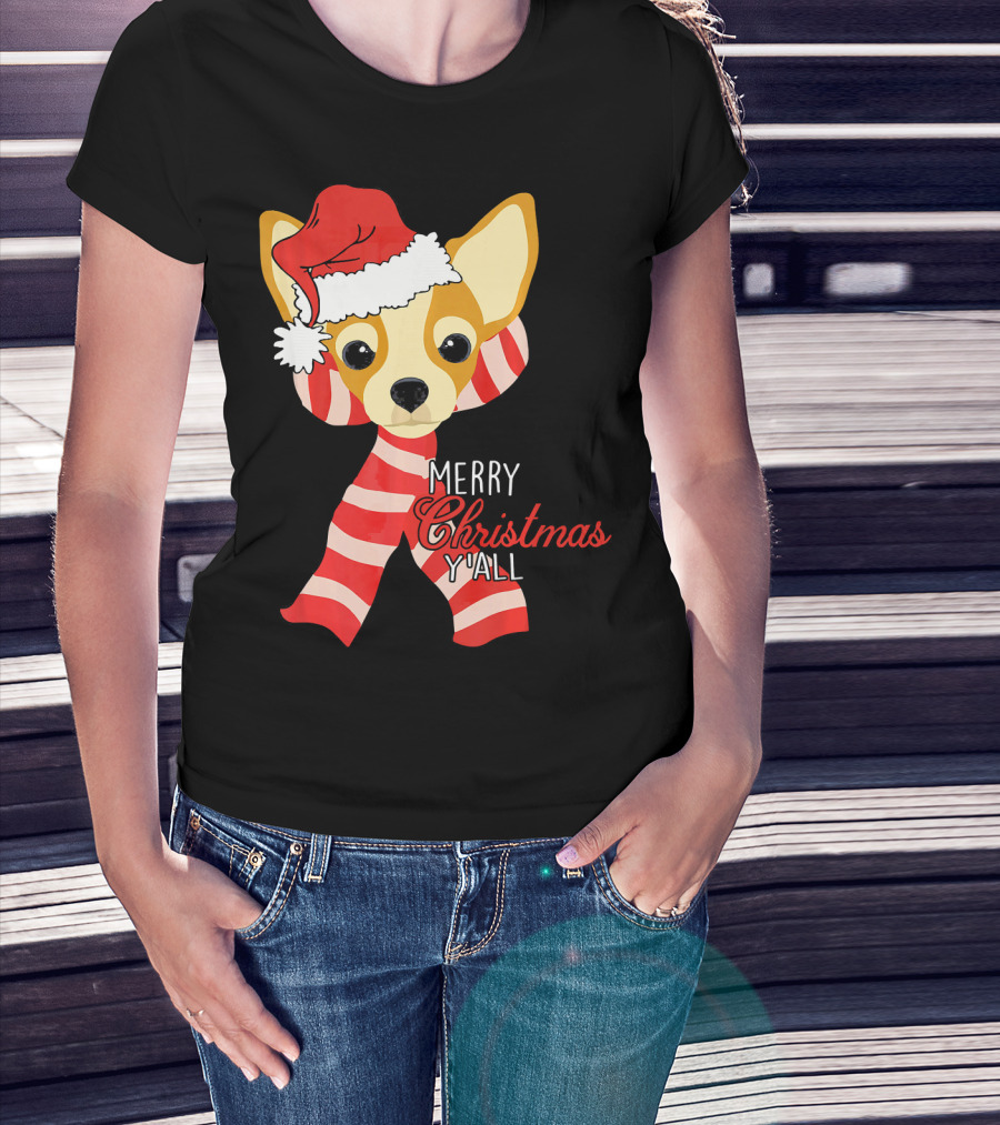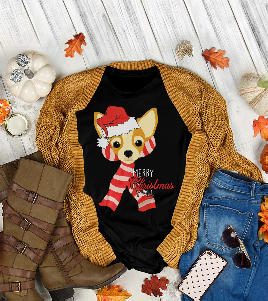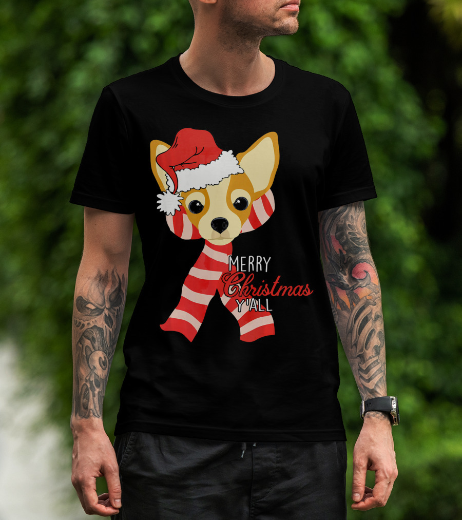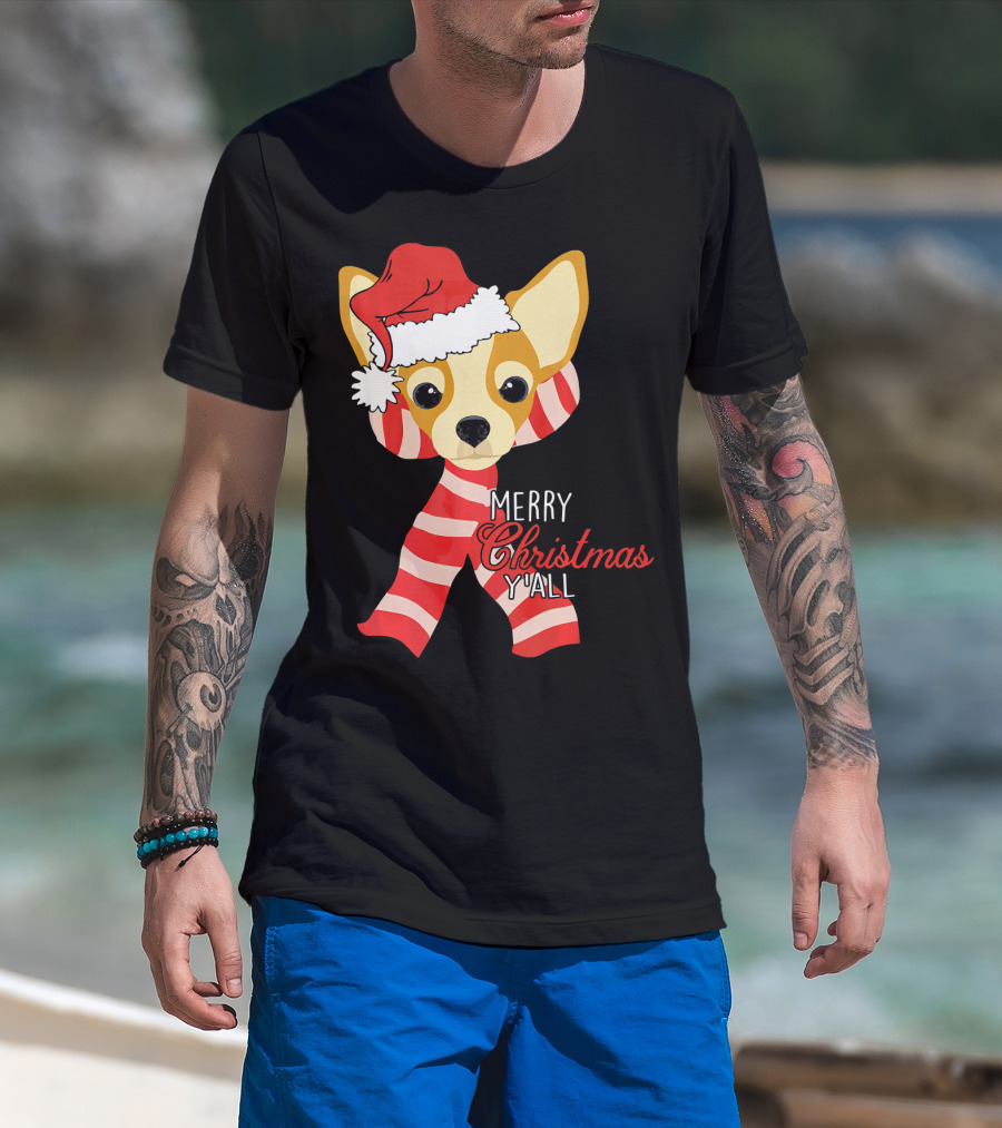 Merry Christmas Y'all Chihuahua Dog With Santa Hat And Scarf T-Shirt