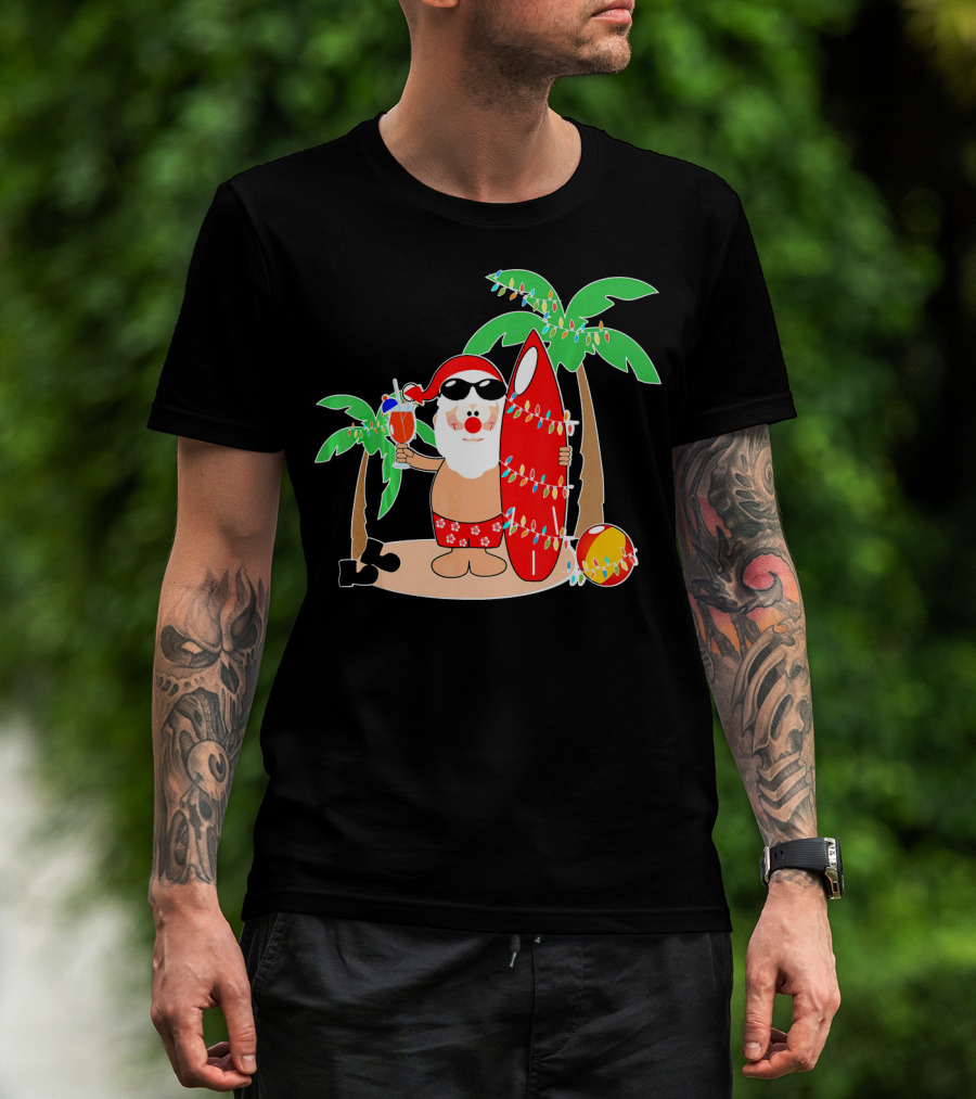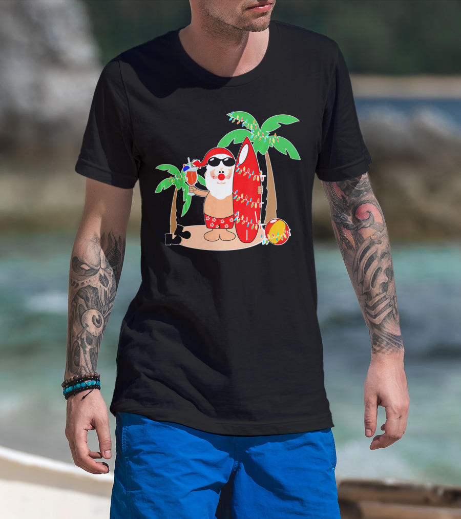 Santa Claus Surfing Hawaiian Summer Palm Trees And Lights T-Shirt