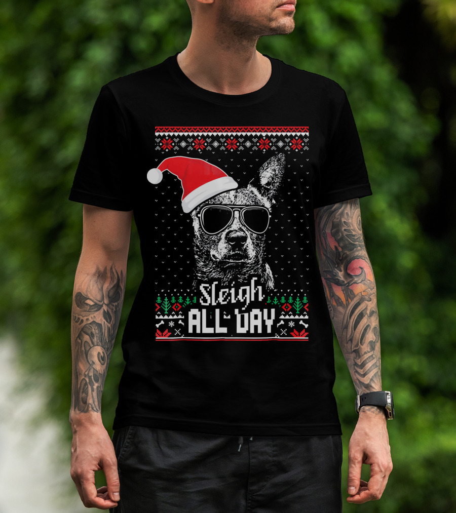 Sleigh All Day Funny Australian Cattle Dog Christmas Santa Hat Sunglasses Festive Knit T-Shirt