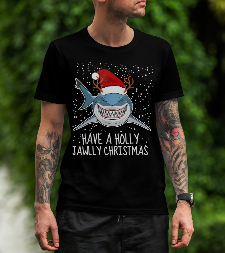 The Have a Holly Jawlly Christmas Shark Santa Hat Reindeer Antlers T-shirt is designed for everyday wear and a consistent fit. Fabric is pre-shrunk ring-spun cotton with durable stitching. See the size chart below for exact measurements.