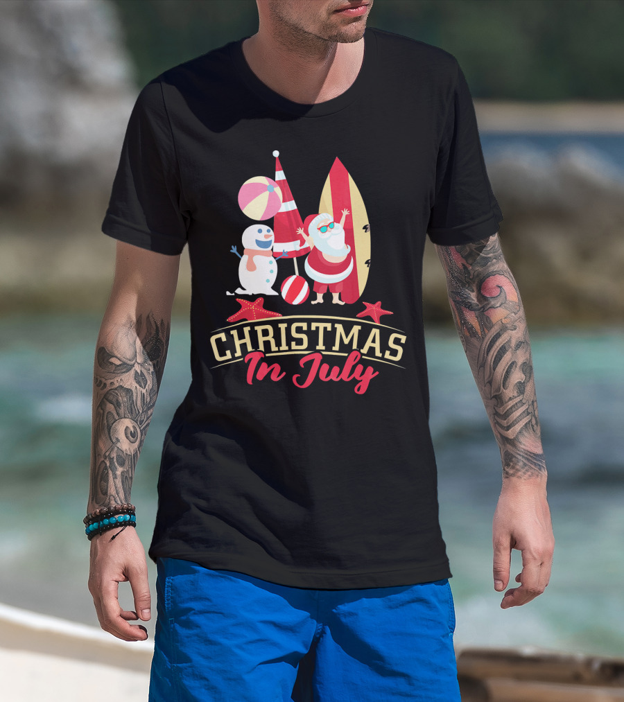 The Christmas in July Santa Surfing Snowman Beach Ball T-shirt is designed for everyday wear and a consistent fit. Fabric is pre-shrunk ring-spun cotton with durable stitching. See the size chart below for exact measurements.