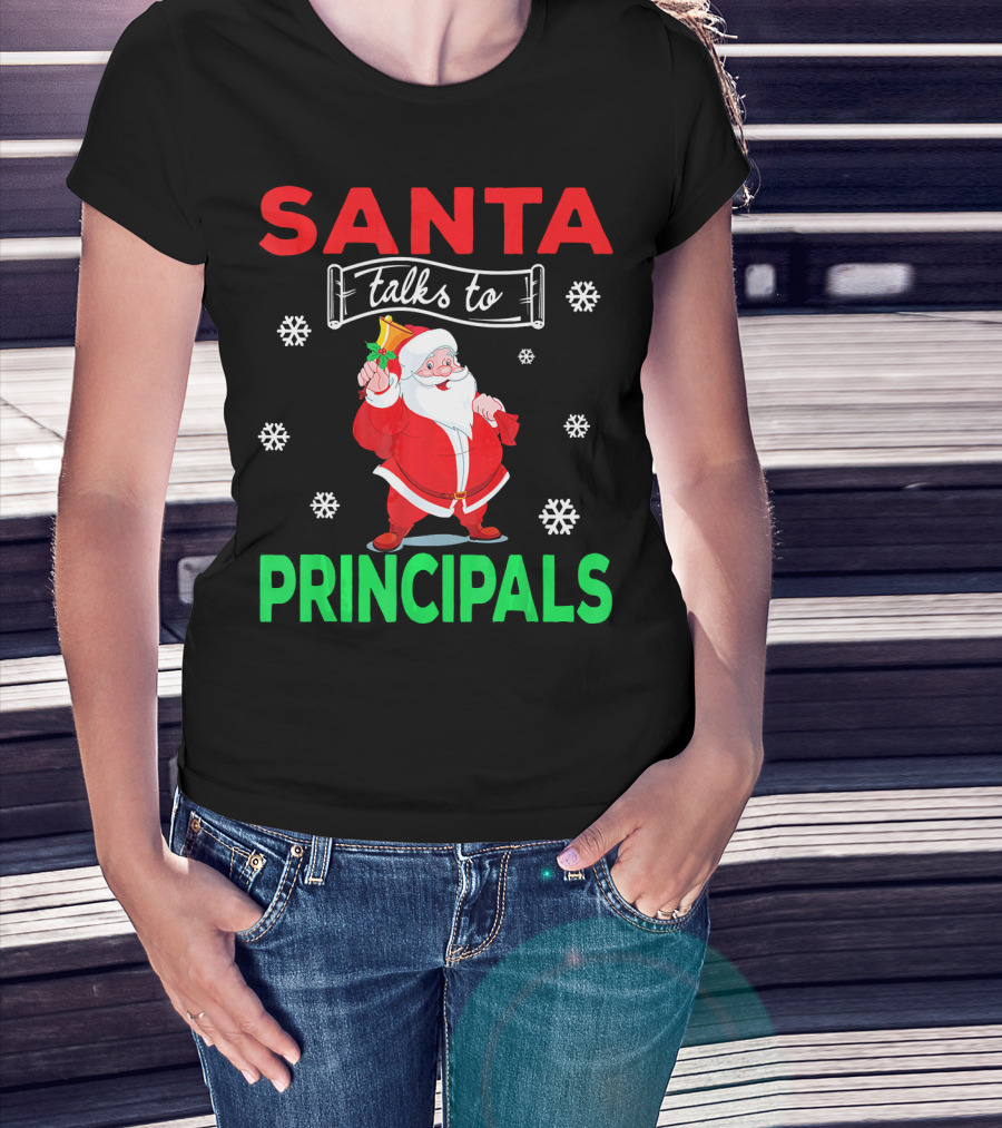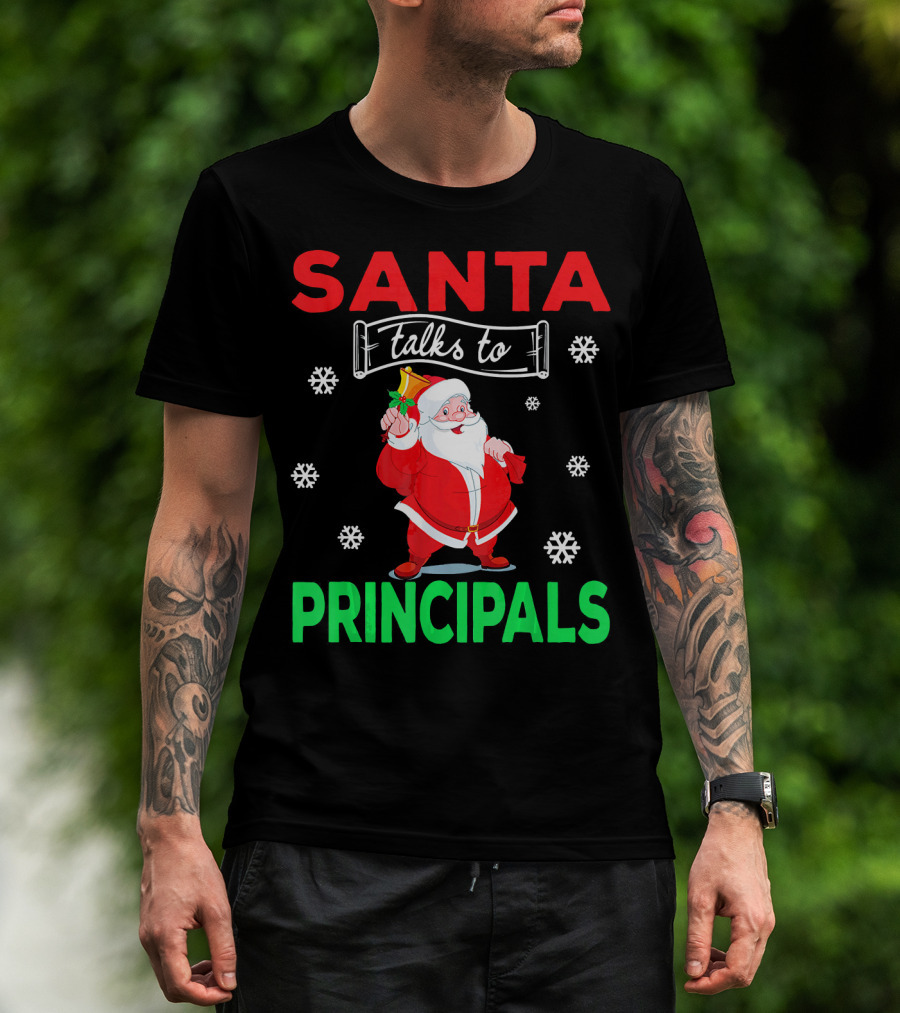 Santa Talks To Principals Funny Merry Christmas Text With Santa Claus And Snowflakes T-Shirt