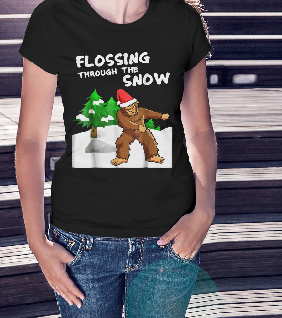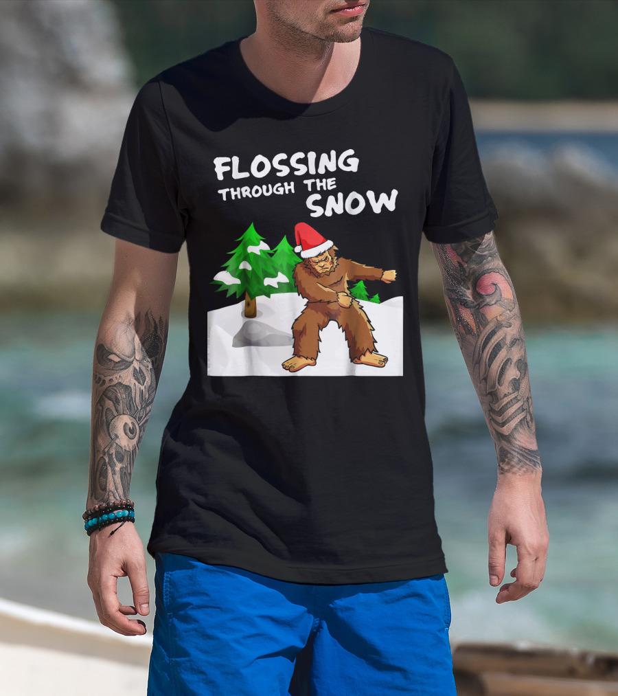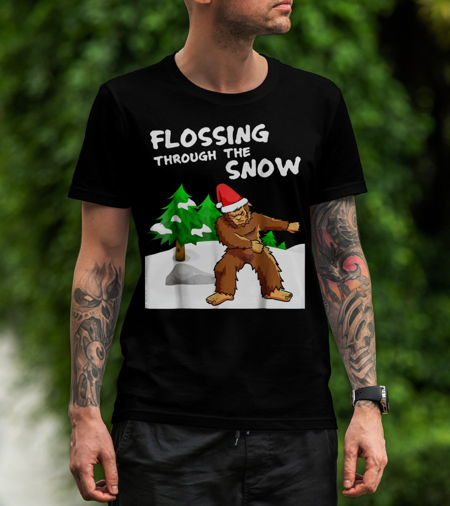 Flossing Through The Snow Bigfoot Santa Hat Winter Scene T-Shirt