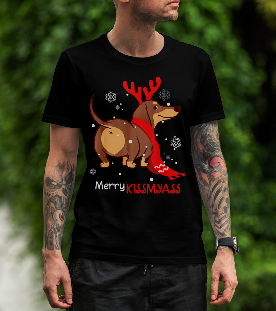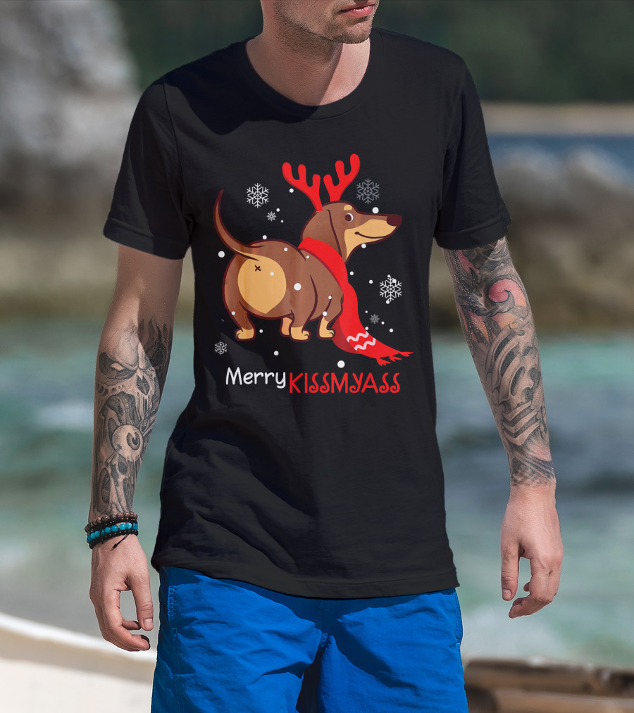 Funny Dog Dachshund Christmas Merry Kiss My Ass T-Shirt