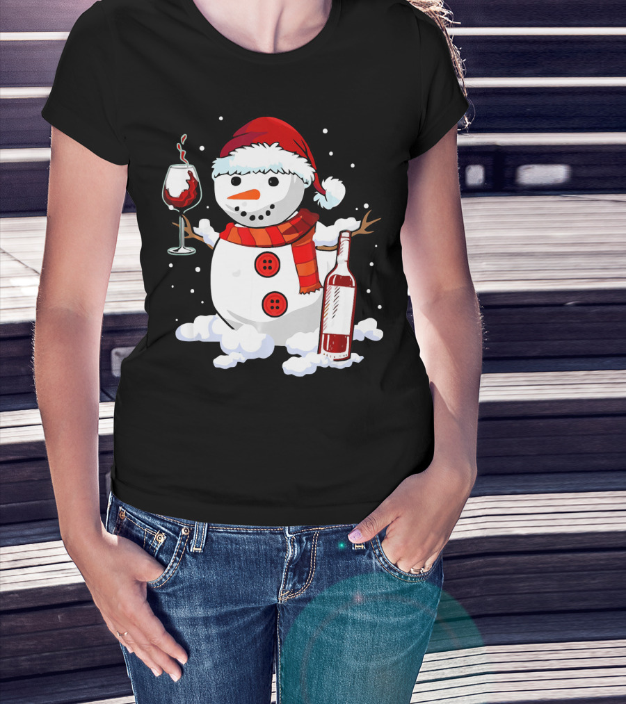 Snowman With Santa Hat And Scarf Holding Wine Glass And Bottle Christmas Drinking T-Shirt