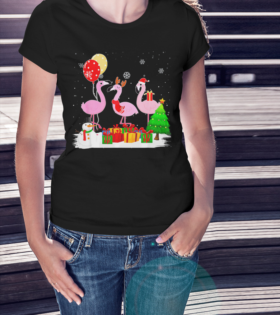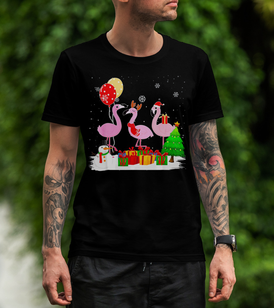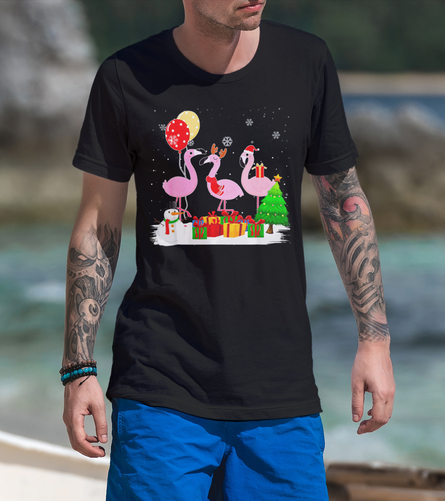 Three Flamingos Xmas Santa With Christmas Tree Presents Snowman Balloons T-Shirt