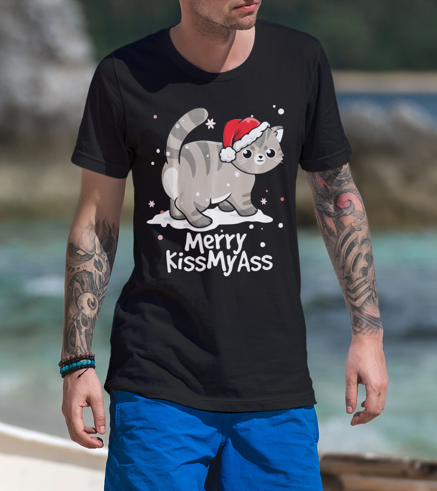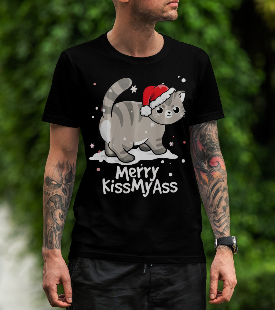 Merry KissMyAss Cat With Santa Hat In Snowflakes T-Shirt