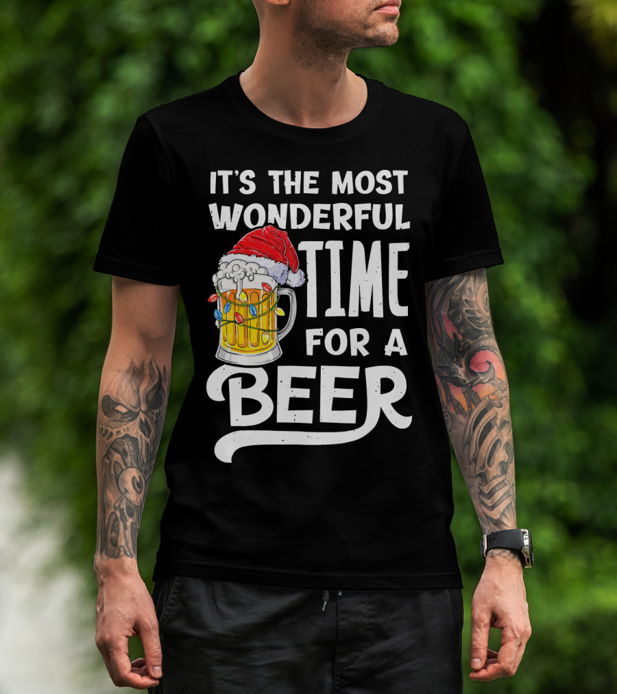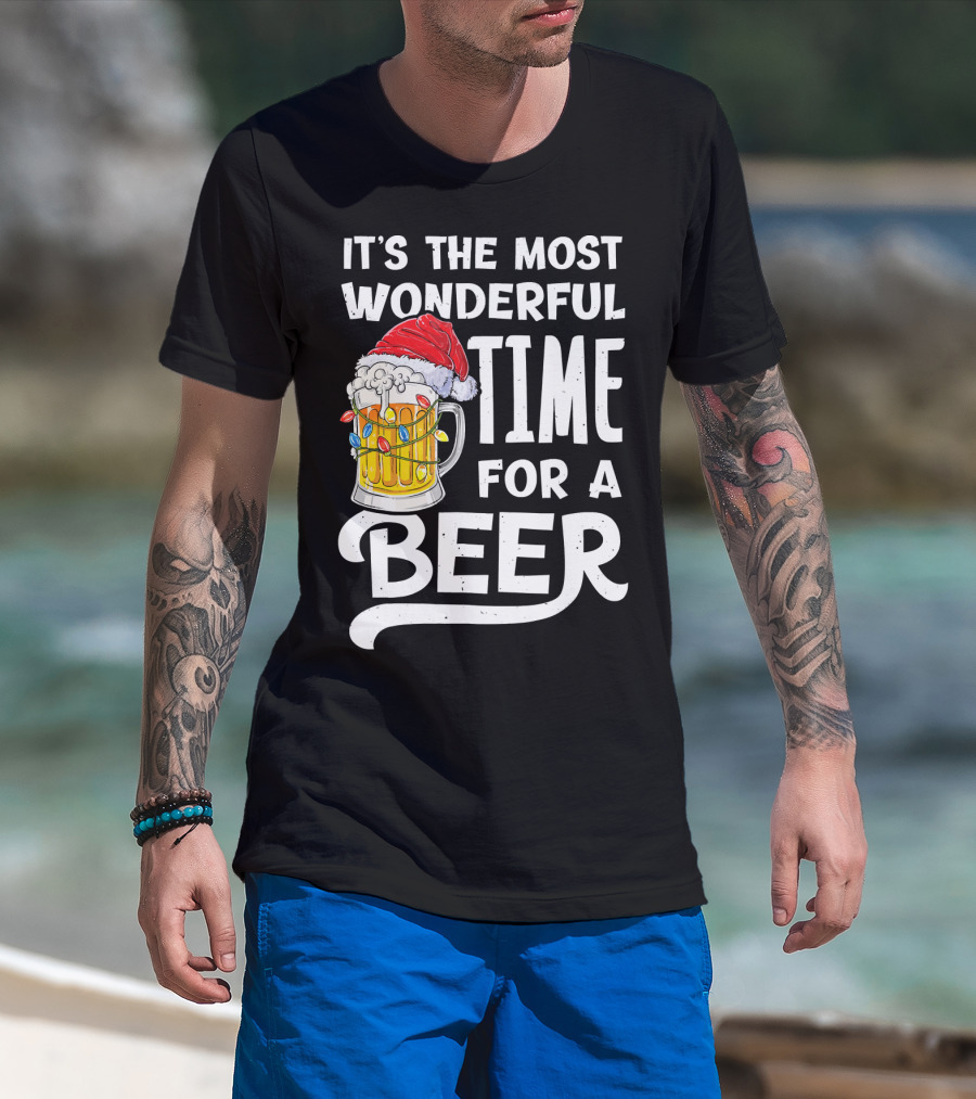 It's The Most Wonderful Time For A Beer With Santa Hat And Holiday Lights T-Shirt