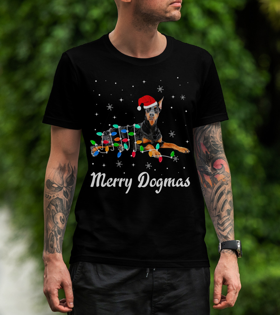 Merry Dogmas Christmas Doberman With Santa Hat And Festive Lights T-Shirt