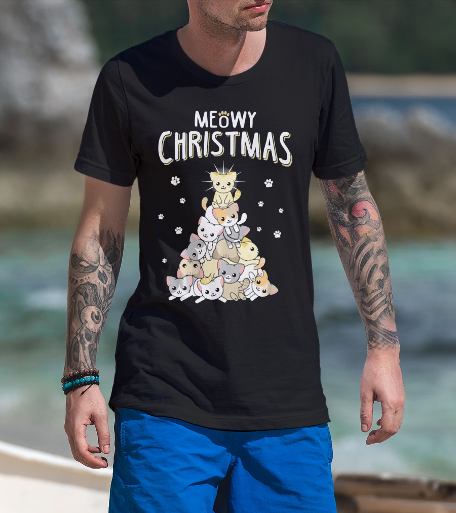 Meowy Christmas Cats Tree With Cute Paw Prints T-Shirt