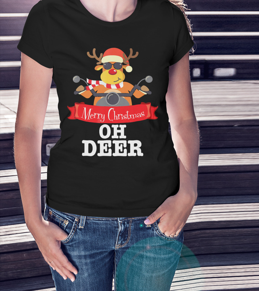 Merry Christmas Oh Deer Reindeer Motorcycle Santa Hat T-Shirt