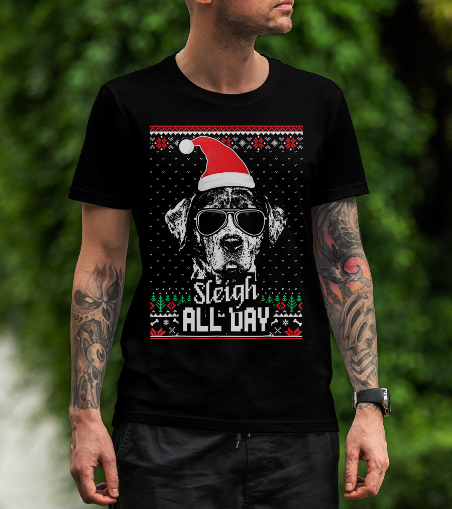 Sleigh All Day Funny Catahoula Cur Christmas Dog With Santa Hat And Sunglasses T-Shirt