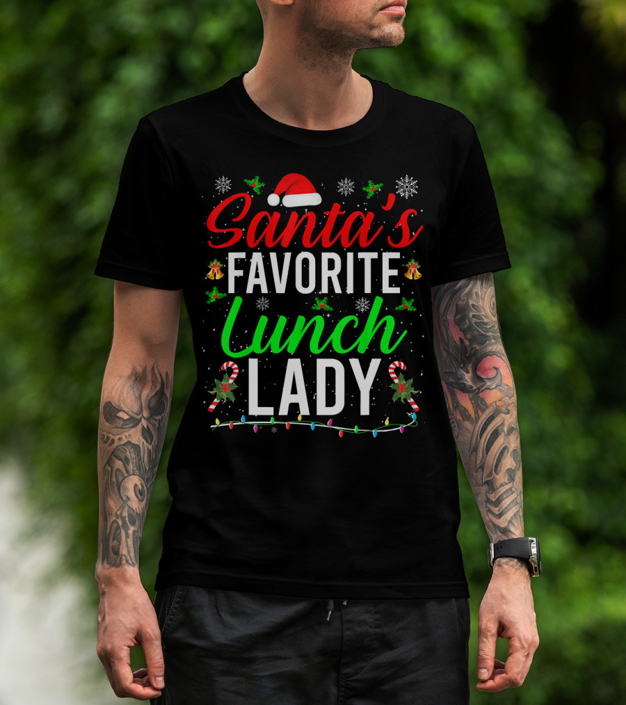 The Santa's Favorite Lunch Lady Christmas Candy Cane Snowflakes T-shirt is designed for everyday wear and a consistent fit. Fabric is pre-shrunk ring-spun cotton with durable stitching. See the size chart below for exact measurements.