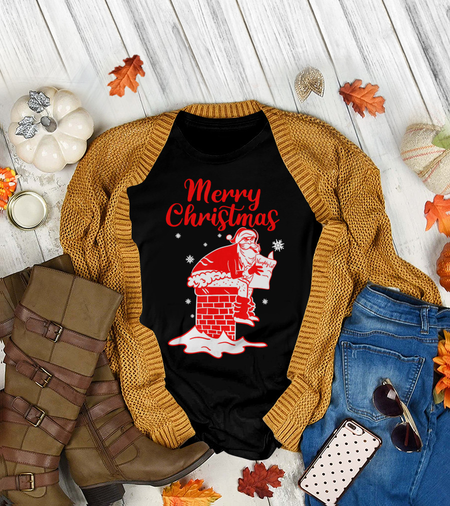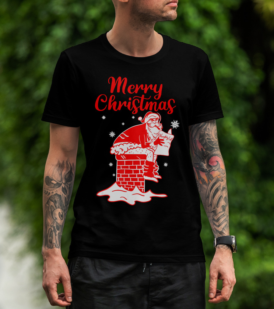 Merry Christmas Santa Pooping Naughty List Snowflakes Chimney T-Shirt